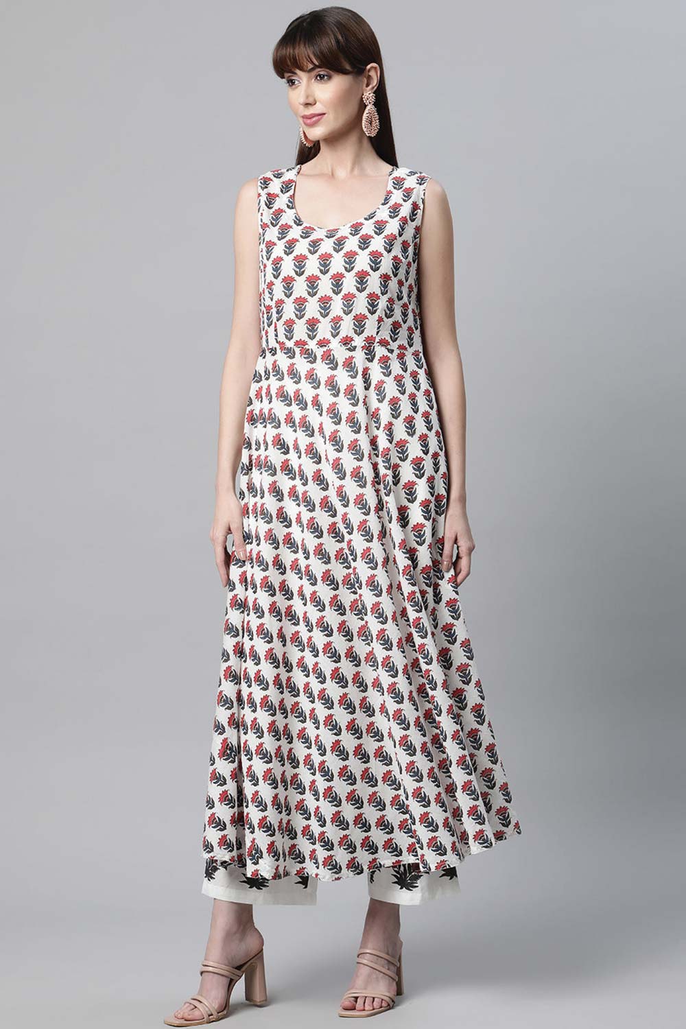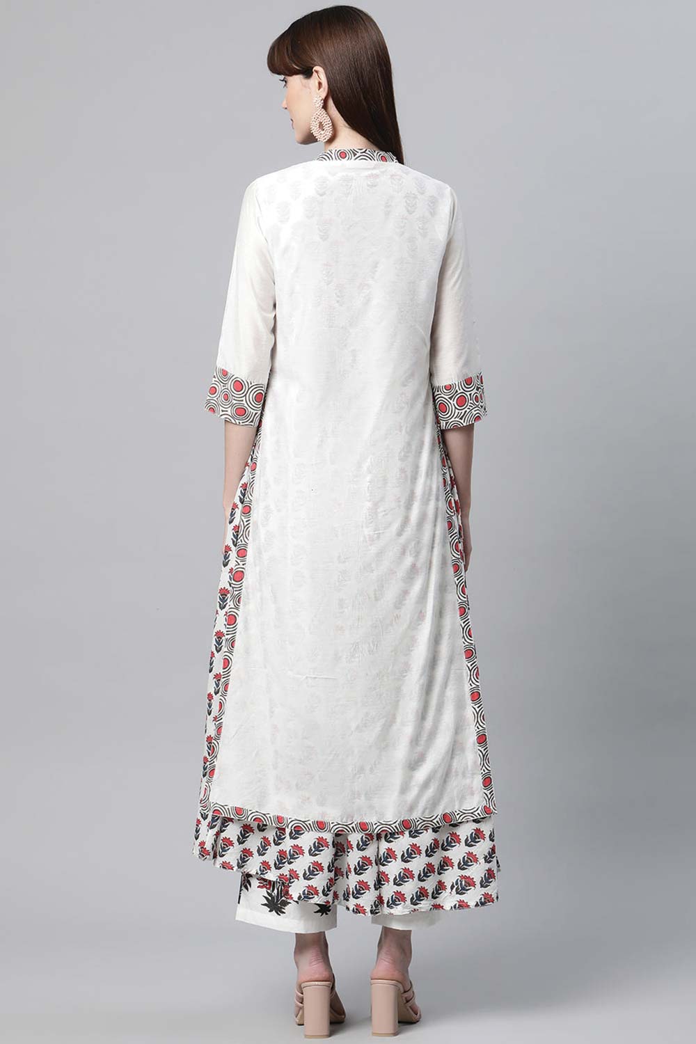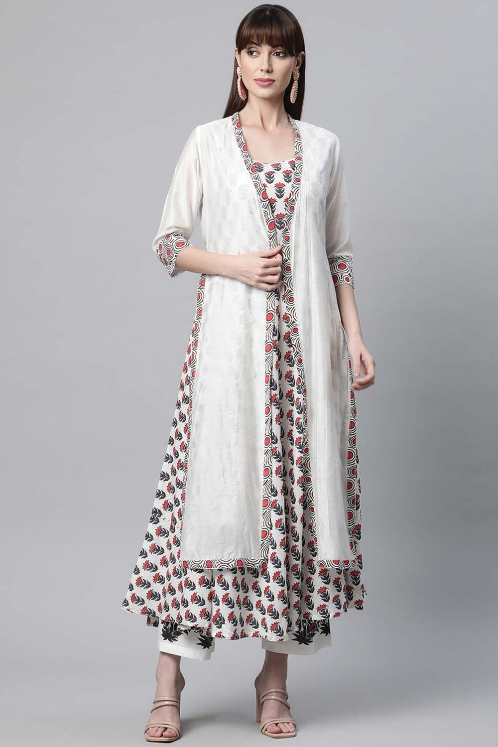 White Floral Kurti Pant Set With Chanderi Shrug