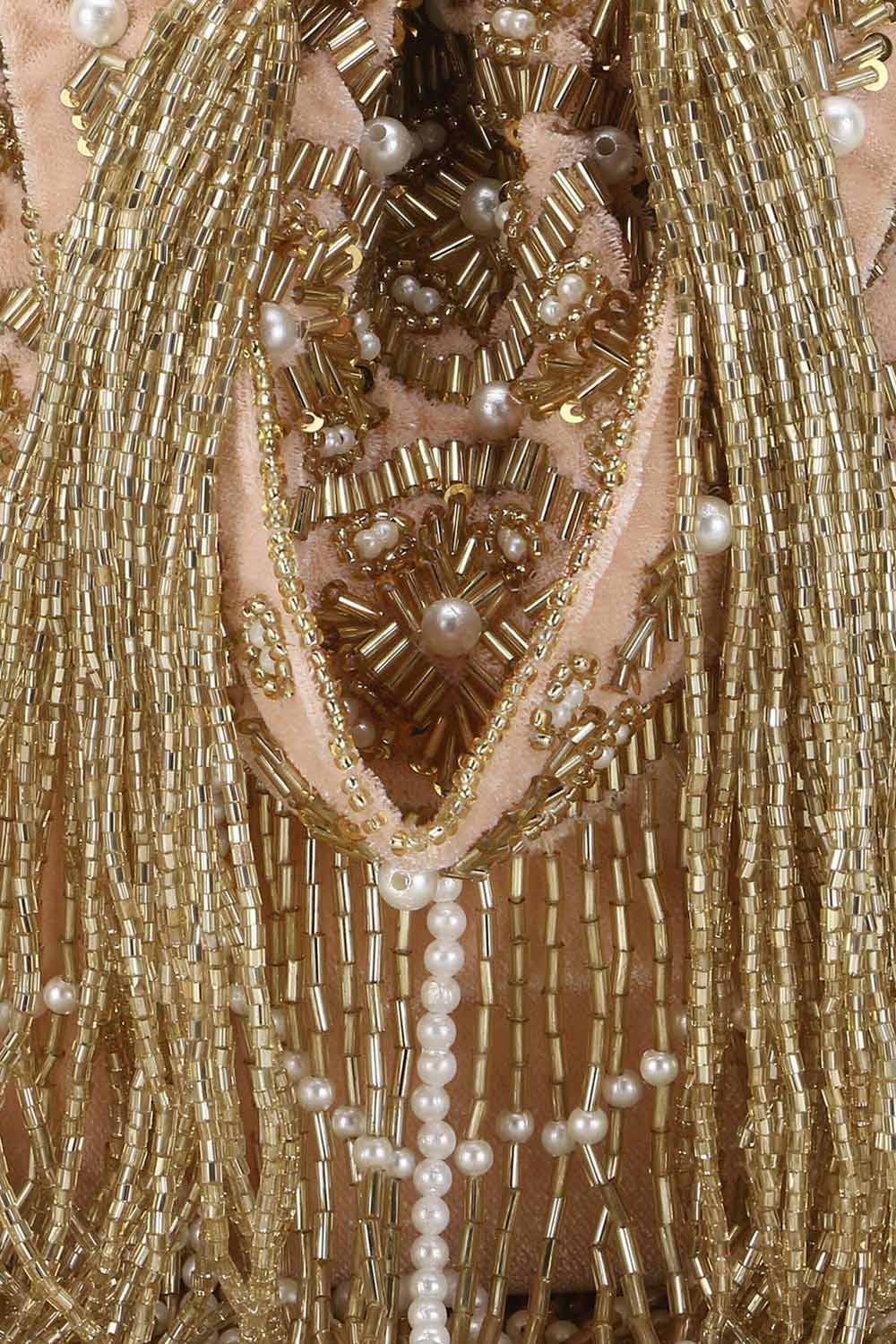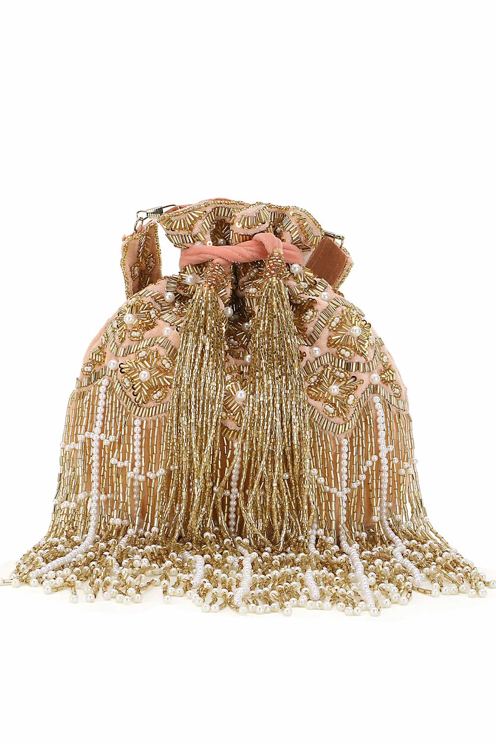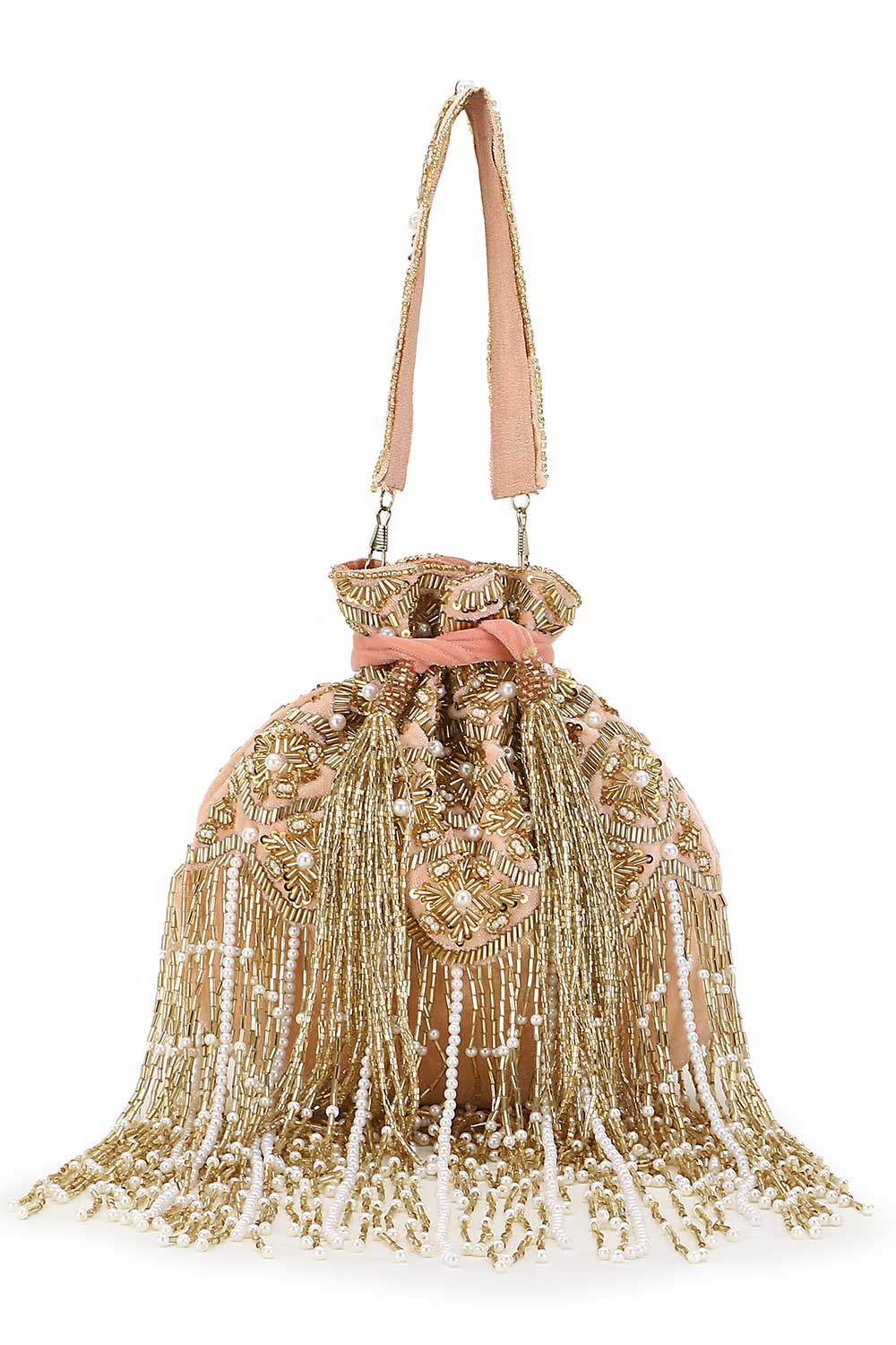 Add elegance & finesse to your look Peach & Gold Potli Clutch. It features an Ogee Embellished pattern on Velvet fabric. Has a Detachable Wrist loop secured with a Drawstring closure.