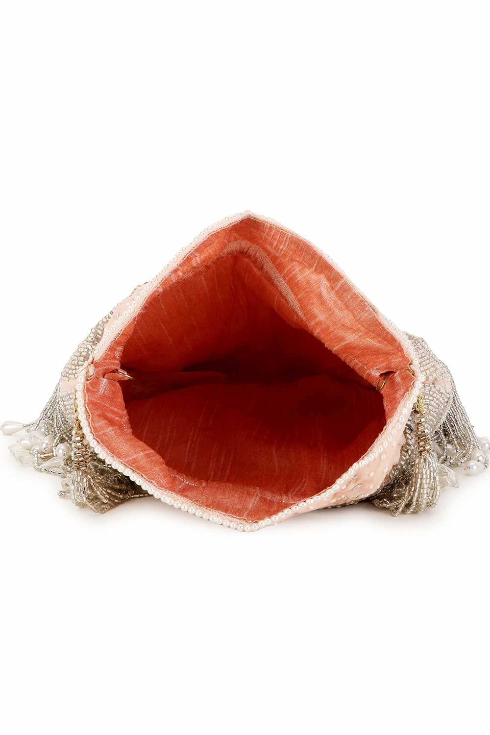 This Peach & Silver Potli comes with a spacious main compartment secured with a Drawstring closure. It features a Chevron Embellished Pattern on Faux Silk fabric and comes with a Detachable Wrist loop decorated with Tassels.