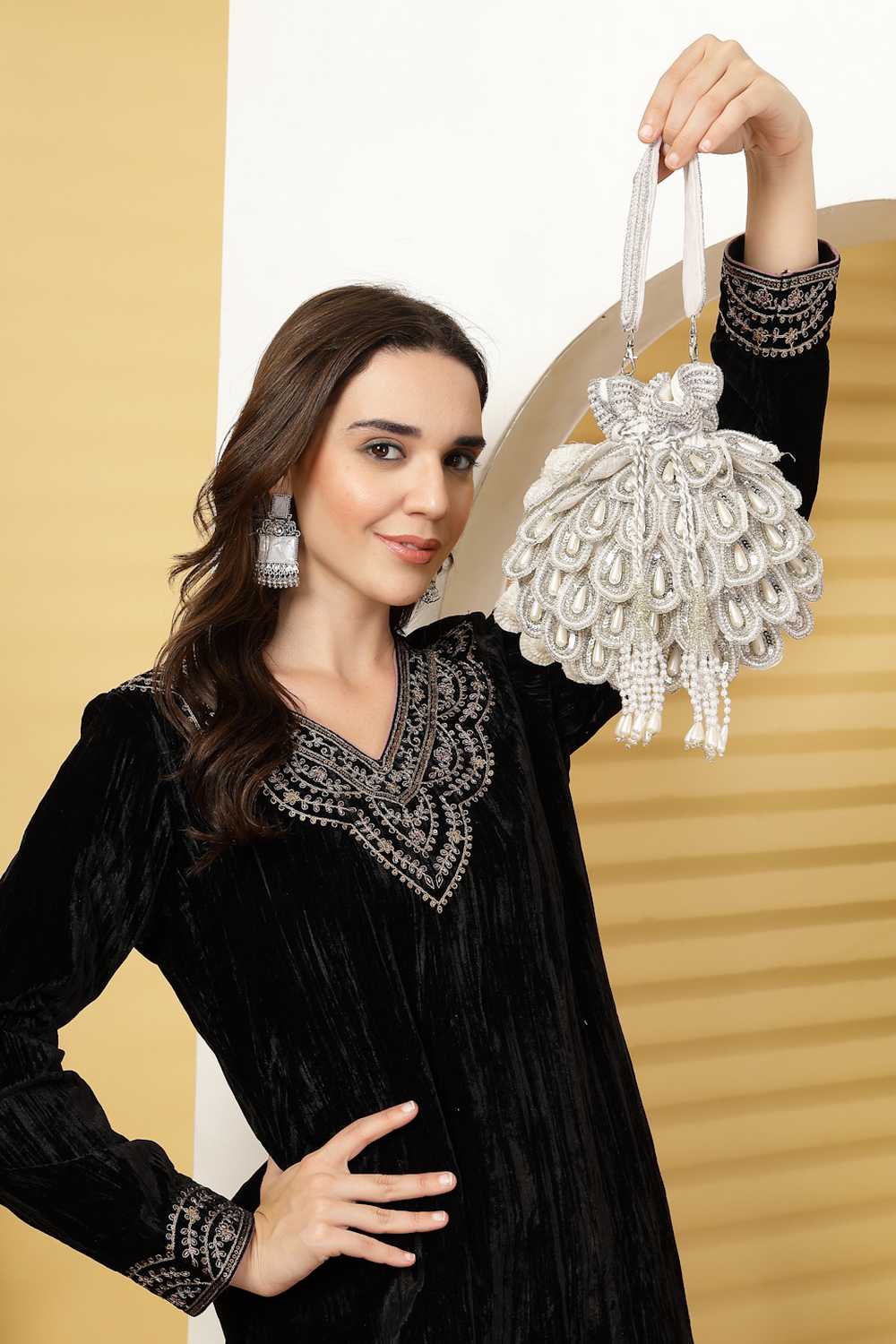 Stay stylish on the go with our Potli a must-have bag for every fashionista. Crafted from premium Velvet and adorned with Cut Work Embellished this bag combines elegance and practicality. Whether for Wedding or daily use, it’s your ultimate style companion