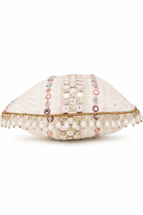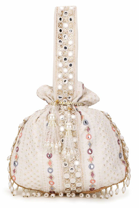 Off White And Multi Faux Silk Mirror Embellished Potli