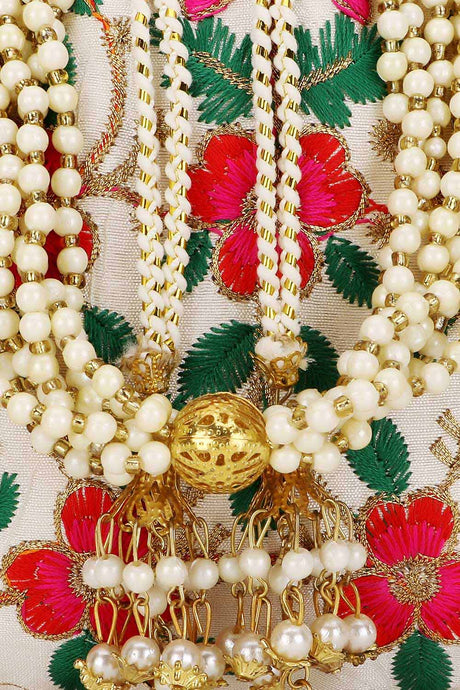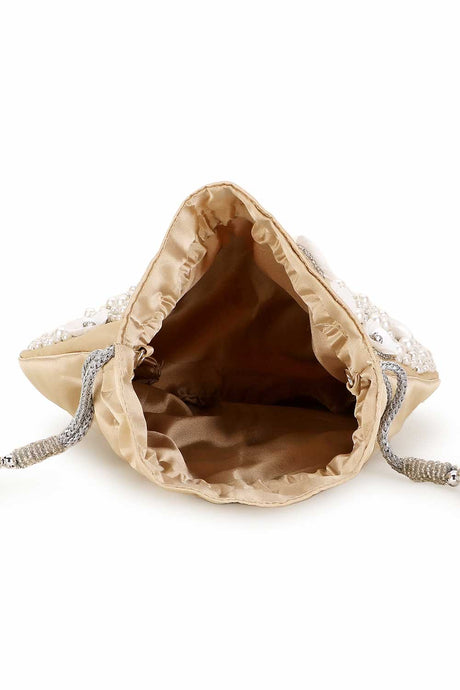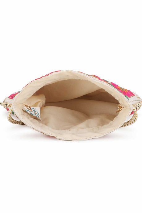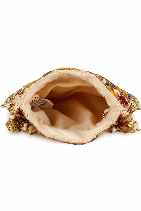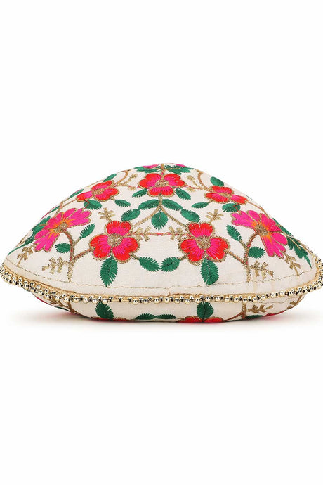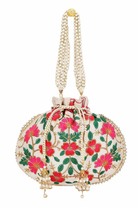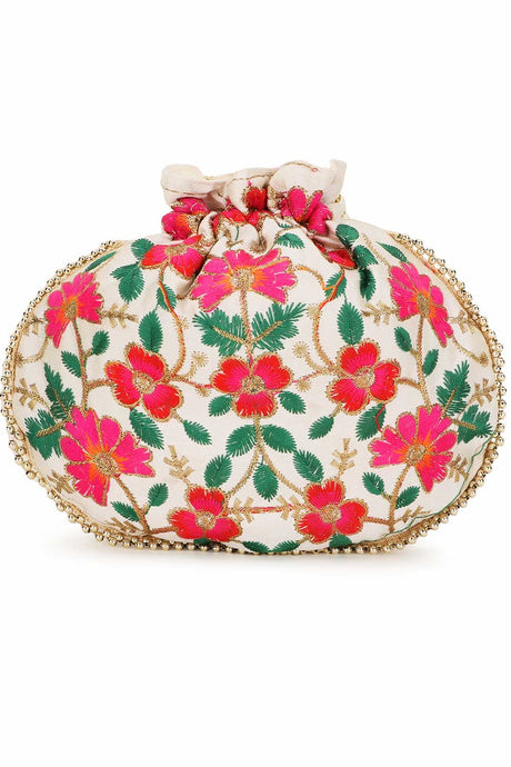 Cream And Multi Faux Silk Floral Embroidered Potli