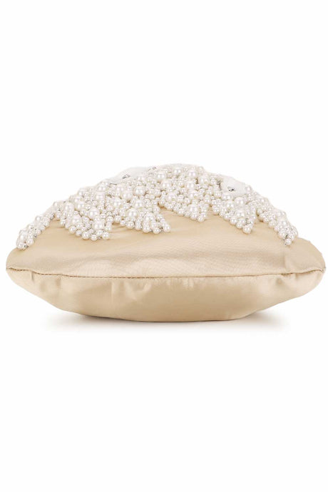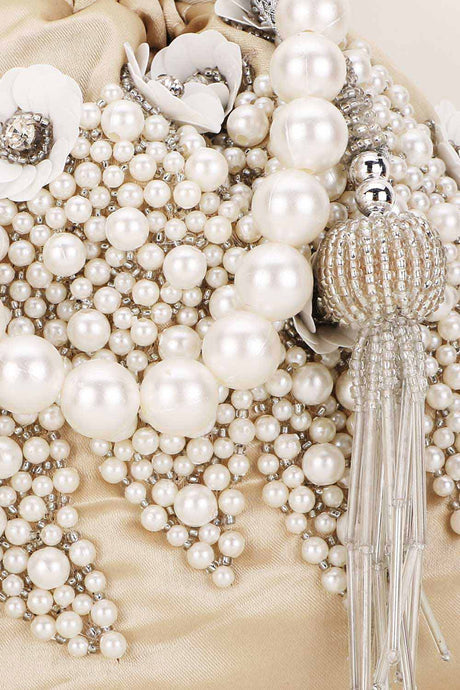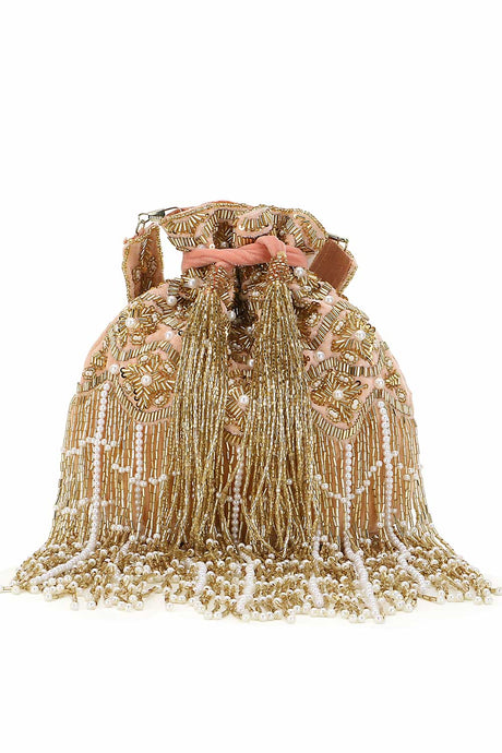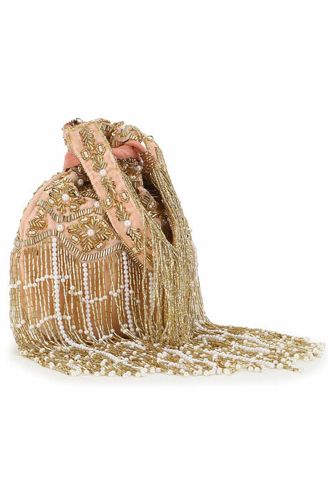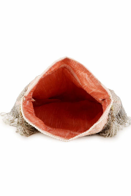 Dangle Peach & Off White Velvet Pearl Embellished Potli