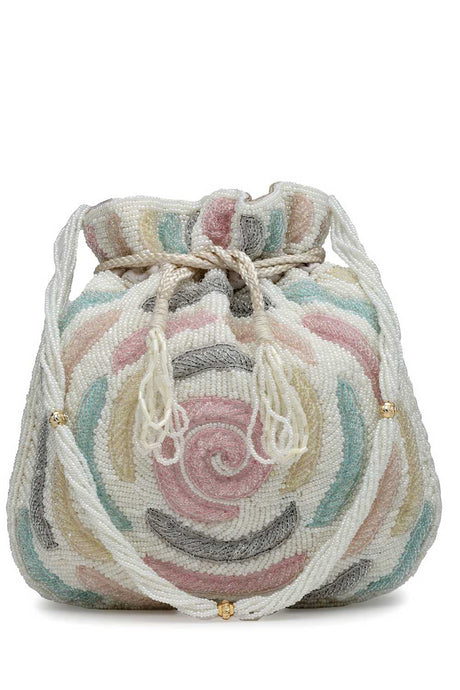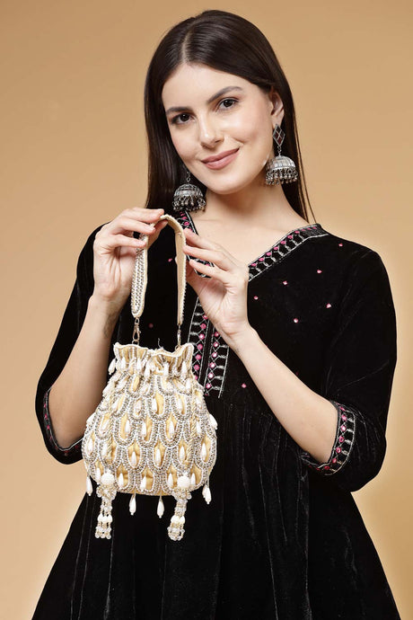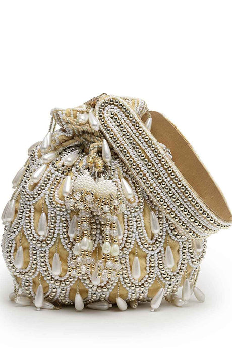 Droop Beige, White And Gold Pearl Embellished Velvet Potli