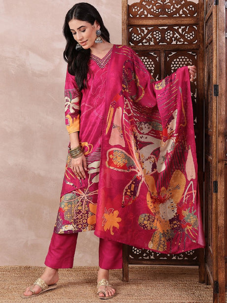 Multi Silk Blend Floral Printed Straight Kurti Pant With Dupatta