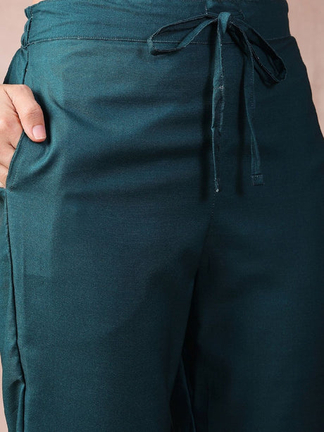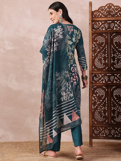 Teal Silk Blend Abstract Printed Straight Kurti Pant With Dupatta