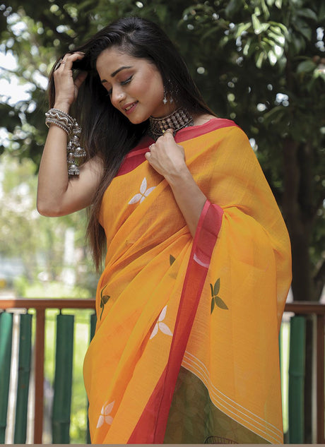 Yellow Linen Digital Printed Saree