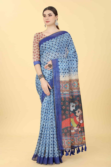Blue Printed Cotton Blend Saree