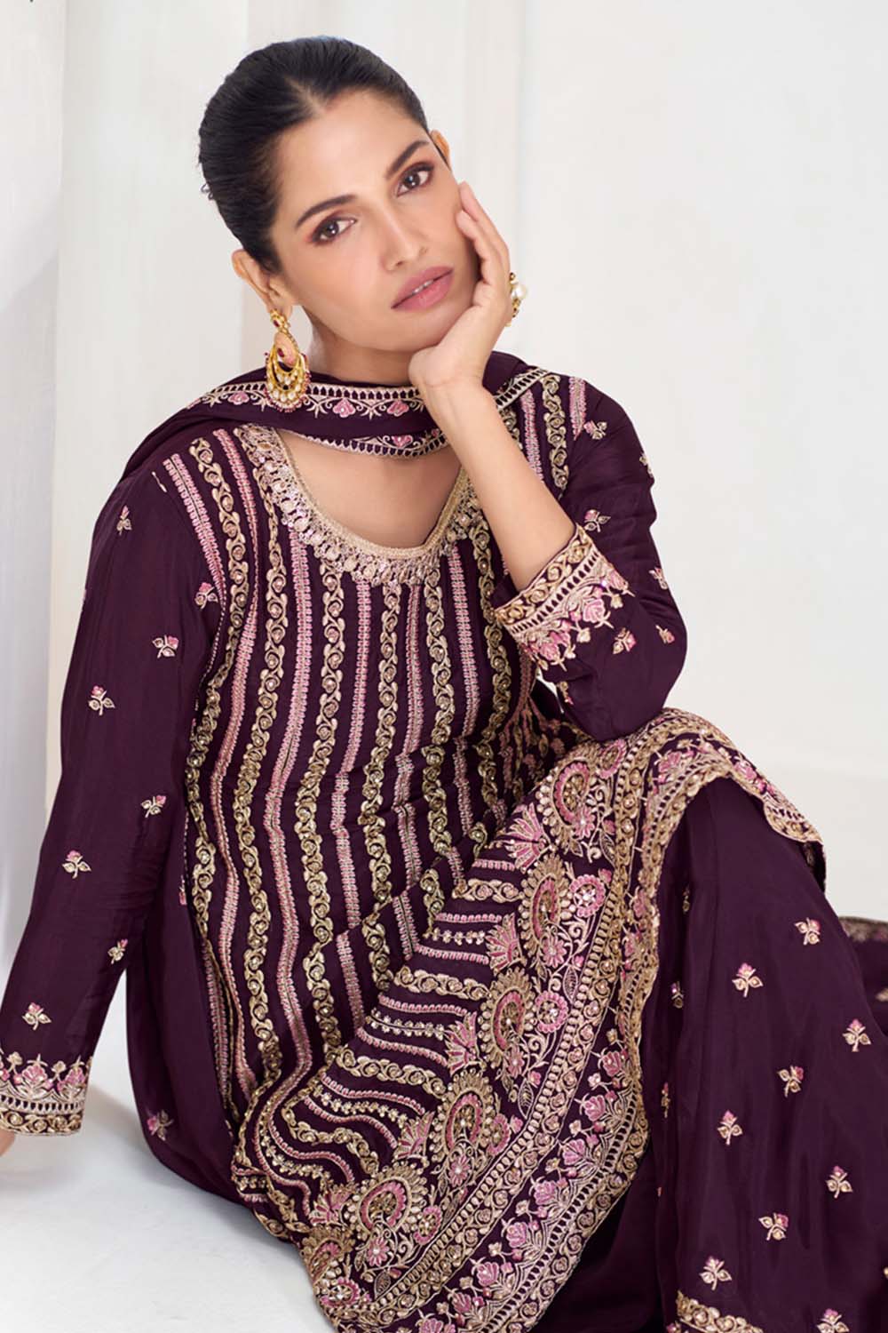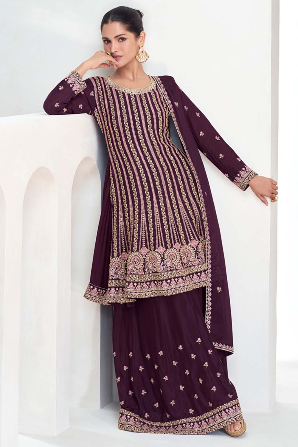 Wine Sequin with Embroidered Art Silk Sharara Suit Set