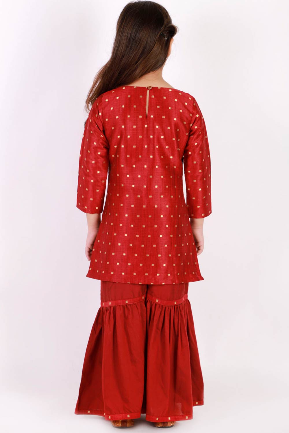 Boys Maroon And Gold Silk Blend Jacket, Kurta And Dhoti Set & Girls Jacquard Kurta With Sharara Set