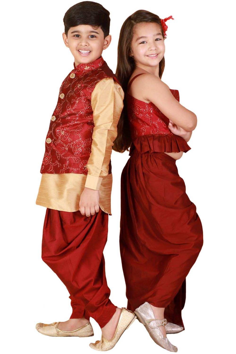 Boys Maroon And Rose Gold Jacket, Kurta And Dhoti Set & Girls Maroon Lehenga Set