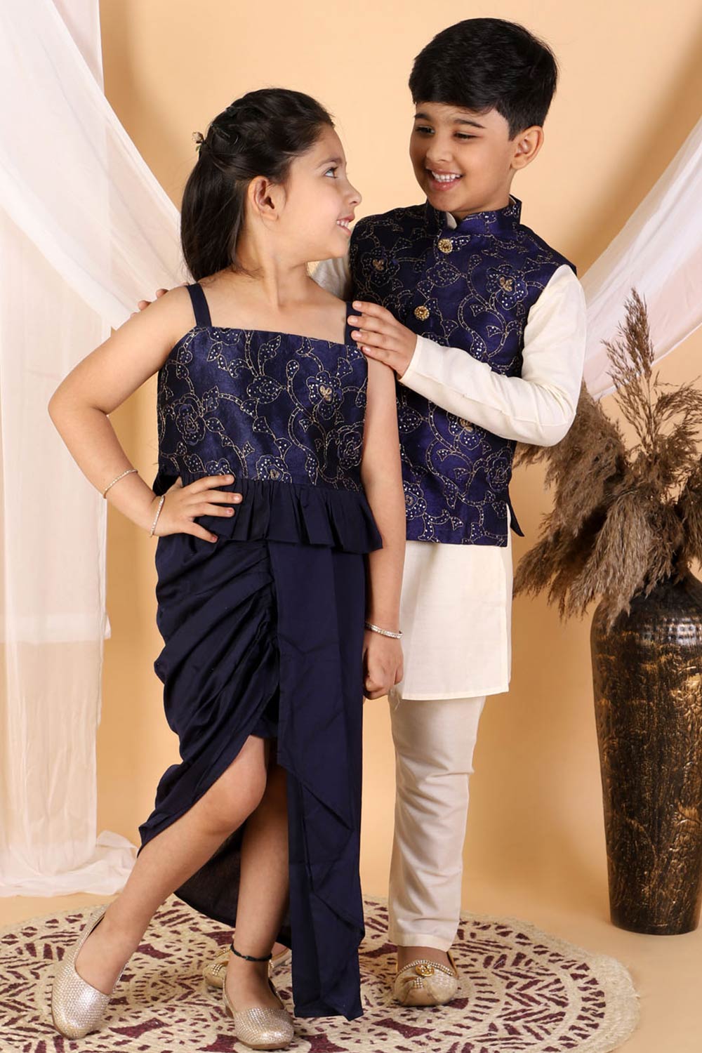 Boys Navy Blue And Cream Jacket, Kurta And Pajama Set & Girls Navy Blue Lehenga Set