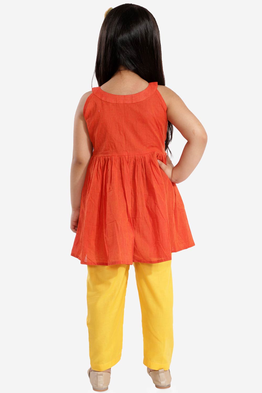A beautifully handcrafted Kurta And Straight Pant Set for Girls. It made with handloom cotton fabric, is sleeveless, has round neck, contrast button closure, is knee length and has straight hem. Comes with contrasting straight pant on elasticated waistband.