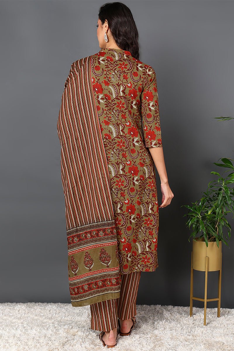Brown Cotton Ethnic Motifs Printed Suit Set