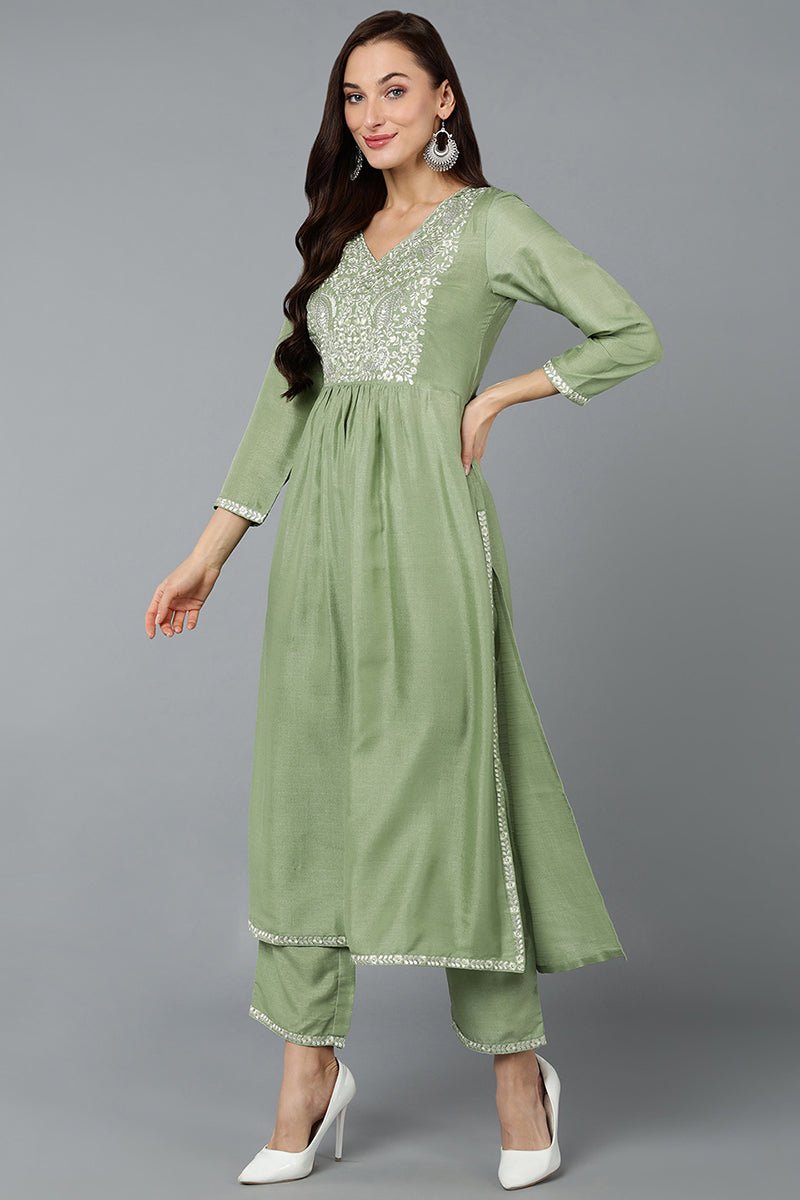 Sea Green Silk Blend Straight Kurti Pant With Dupatta