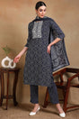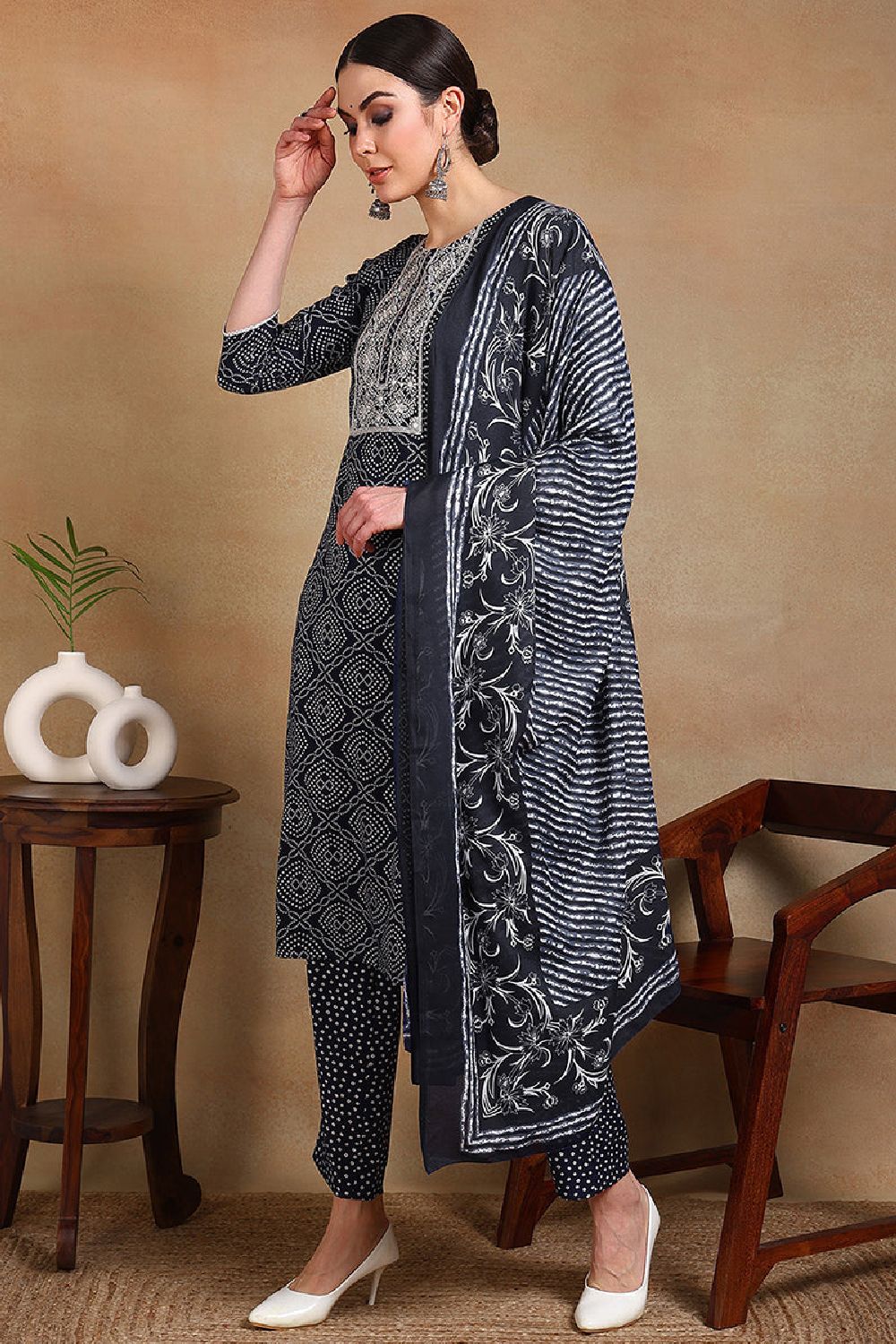 Navy Blue Rayon Blend Bandhani Printed Straight Cut Suit Set