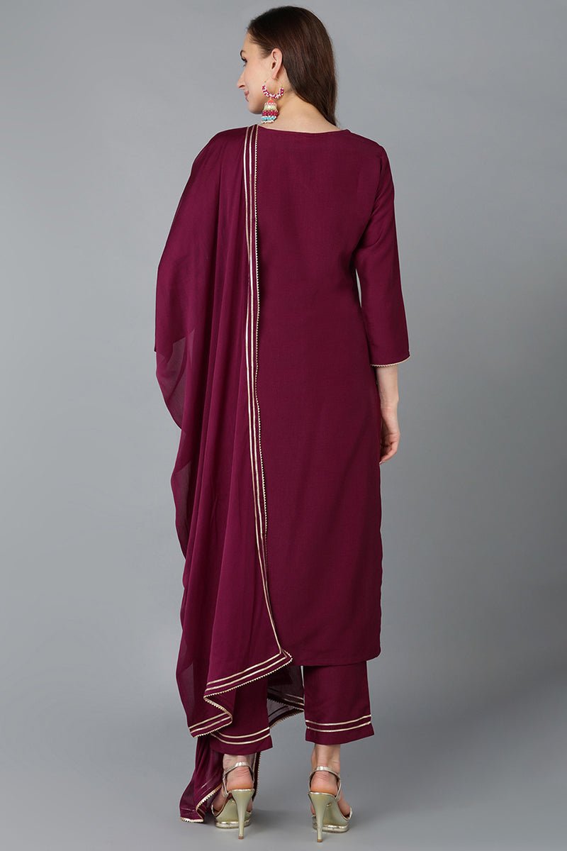 Burgundy Silk Blend Embroidered Straight Kurti Pant With Dupatta