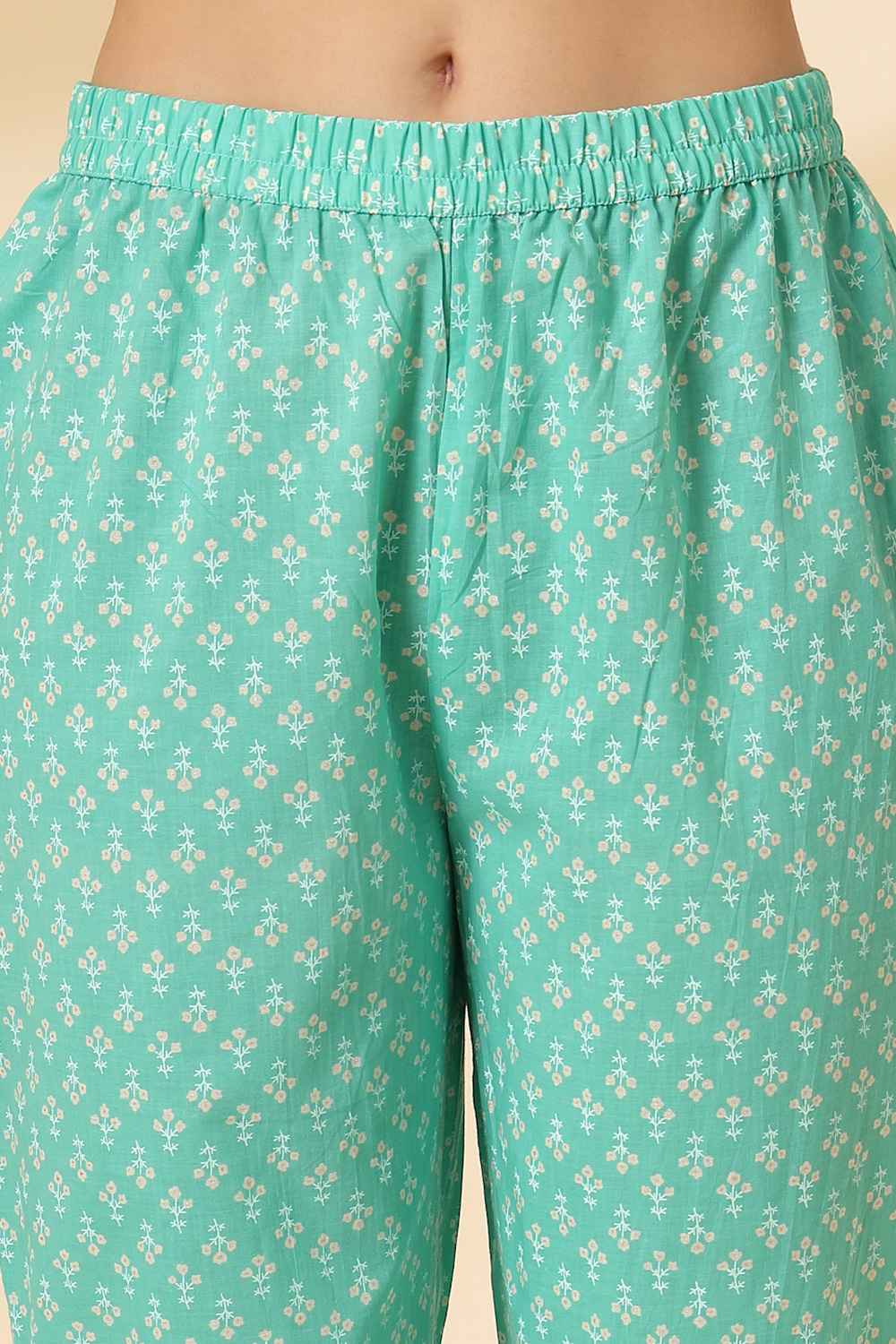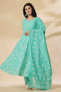 Turquoise Floral Printed Cotton Anarkali Suit Set