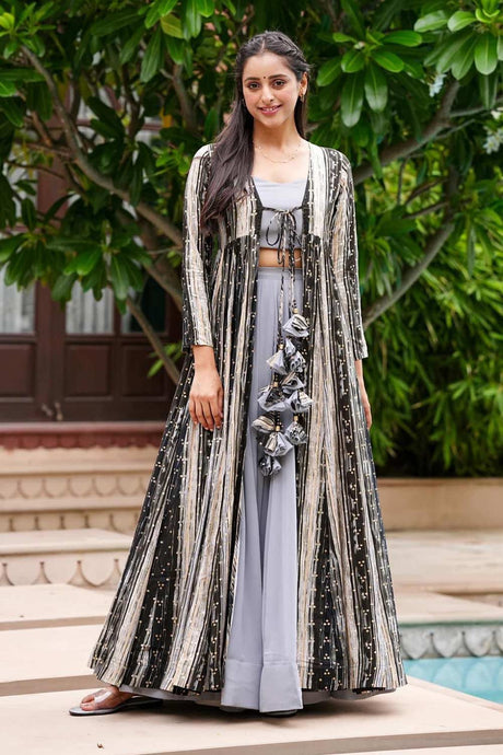 Grey Faux Georgette Digital Printed Indo-Western Suit Set
