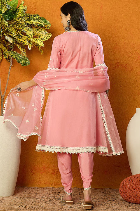 Pink Organza Solid Embroidered A Line Dhoti Style Suit Set