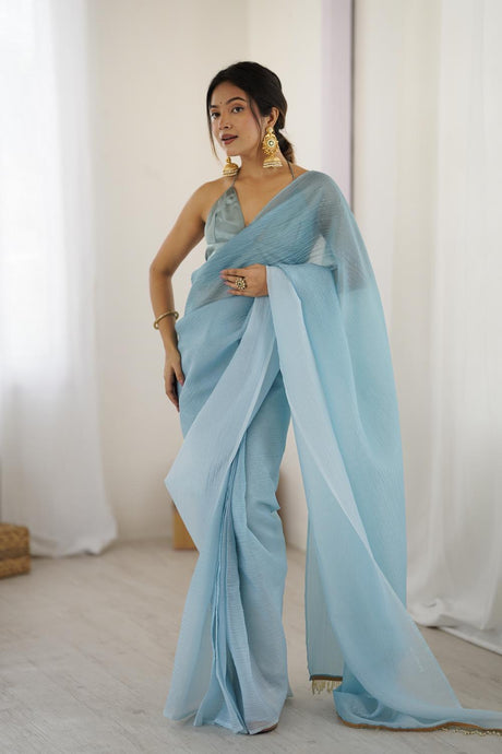 Blue Satin Silk Solid Ready to Wear Saree