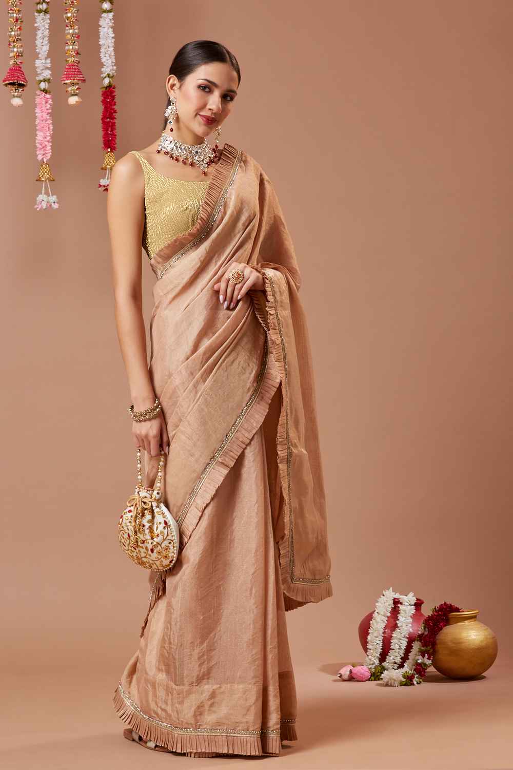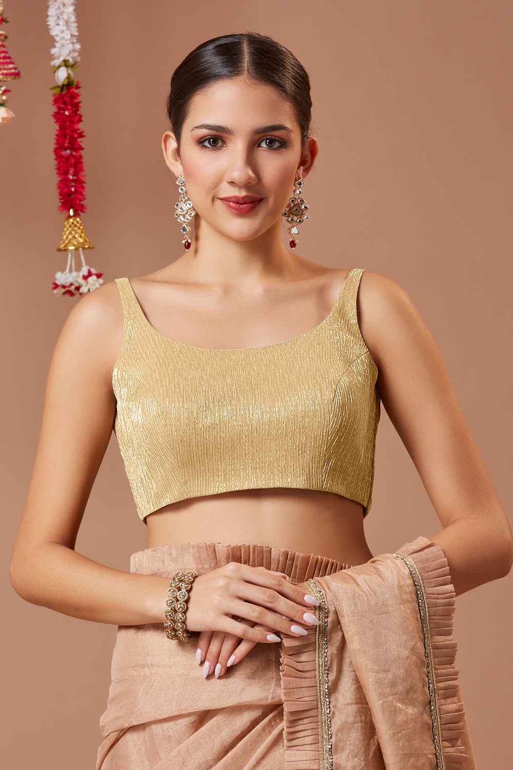Transform your saree look with our Blouse the ultimate blend of style and comfort. Made from soft and breathable Wrinkled Tissue it ensures a snug yet flexible fit. The intricate Shimmer make this blouse a wardrobe essential. Perfect for Festivewear it works beautifully with traditional or modern sarees alike. Team it with a silk saree, a bold necklace, and embellished sandals for a sophisticated look. Redefine your saree style with Blouse