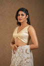 A staple piece to go with almost every sari in your wardrobe, this light gold blouse is crafted in tissue featuring a subtle shine. Create a refreshing look pairing it with organza saris and lehengas or keep it culturally rooted with silk sari for the nuptials.
