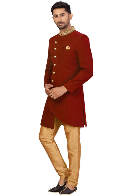 Men's Cotton Solid Pathani Suit Set in Maroon
