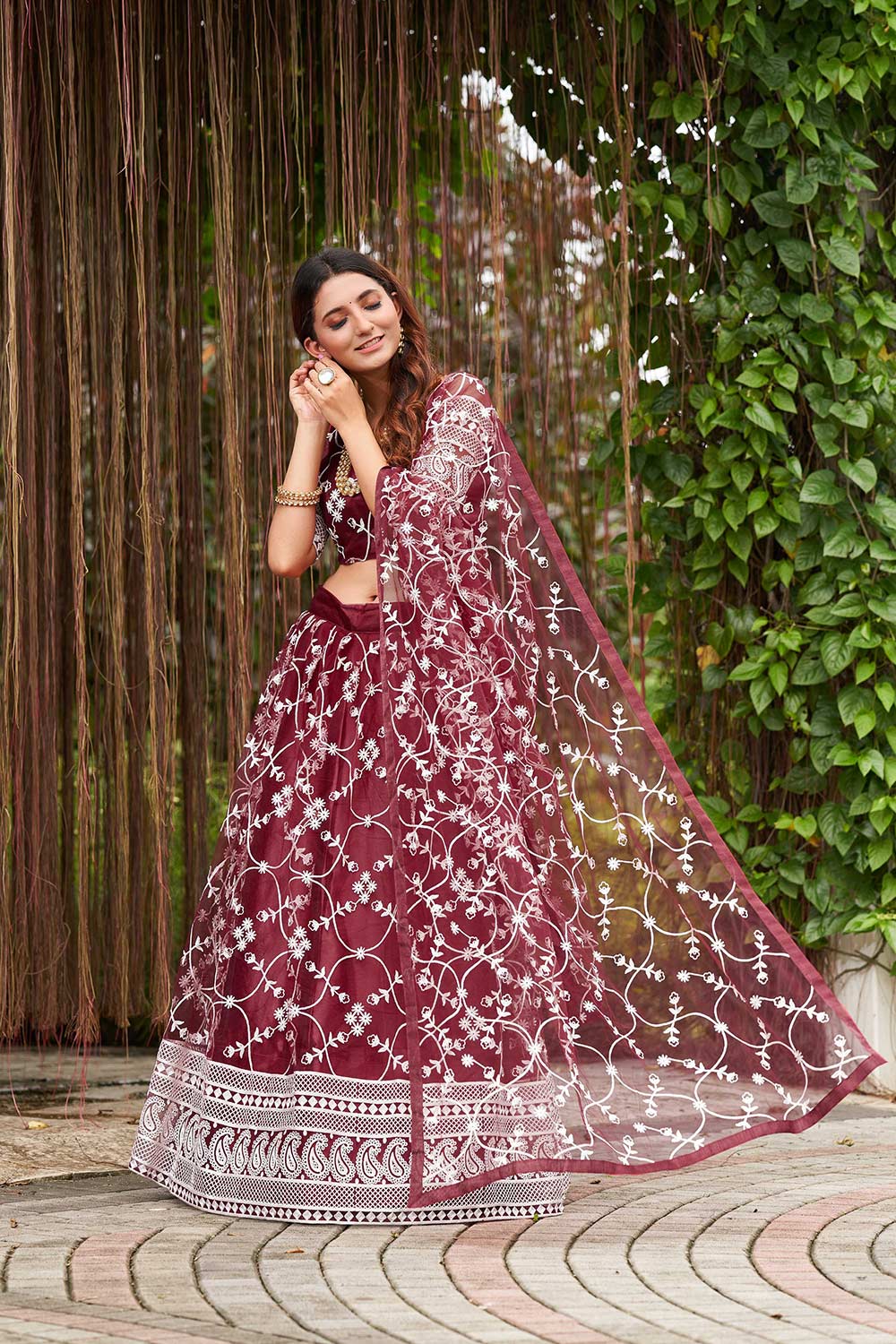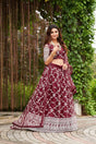 Maroon Net Embroidery Round Neck Lehenga