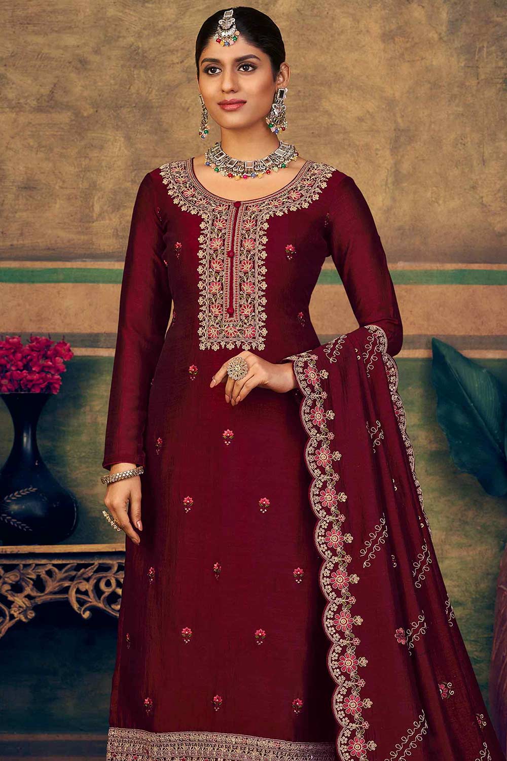 Maroon Pure Silk Embroidered Straight Cut Suit Set