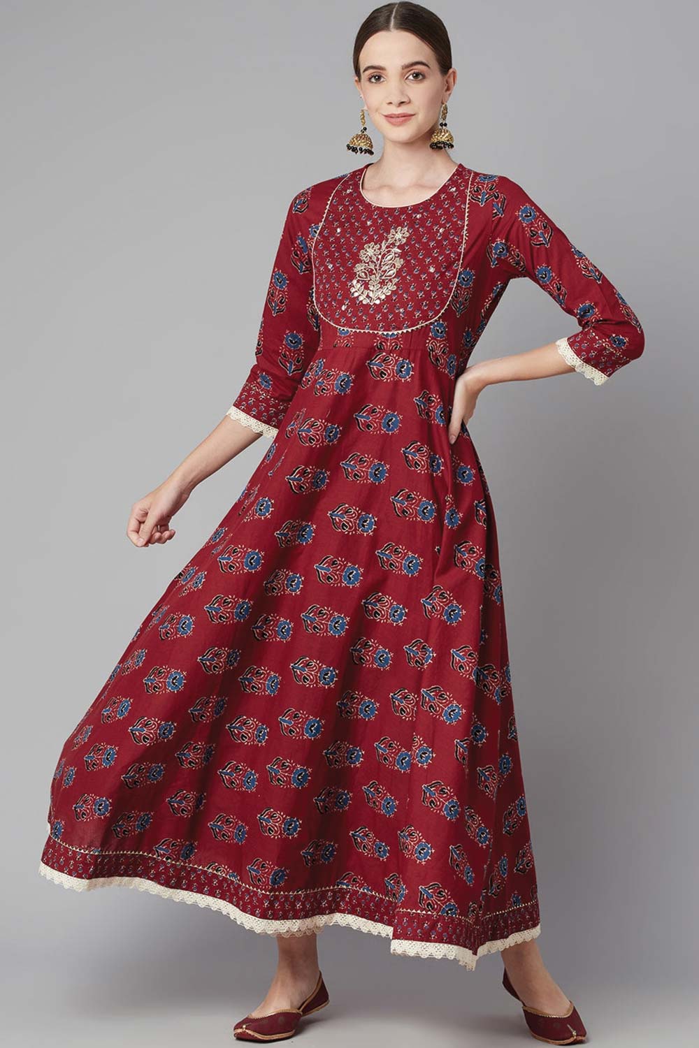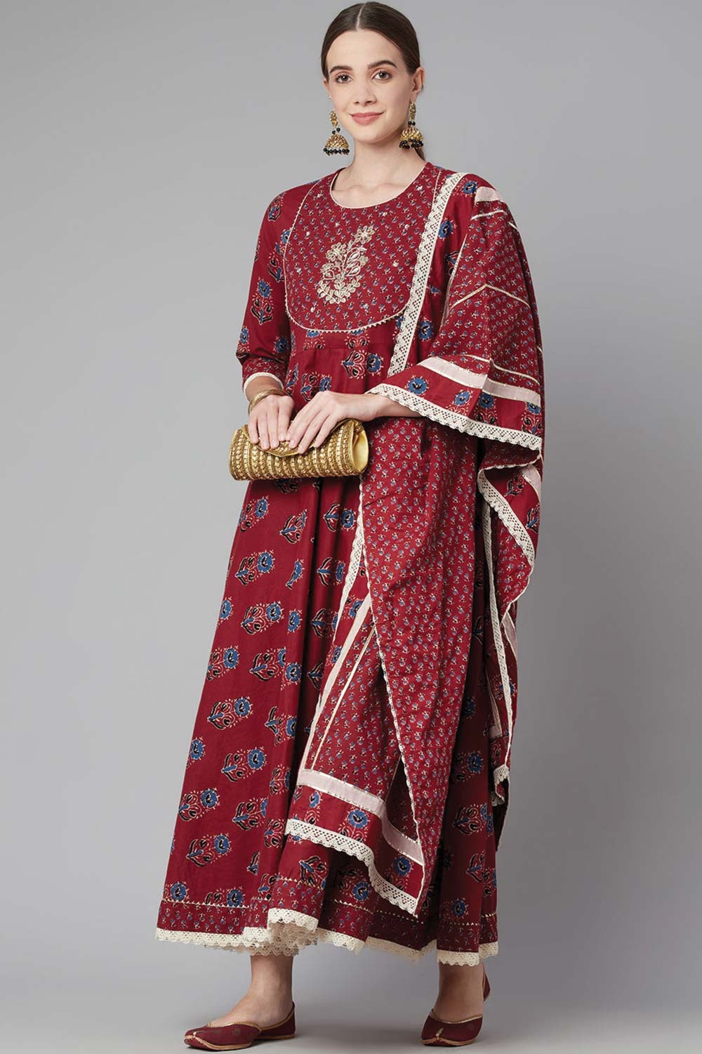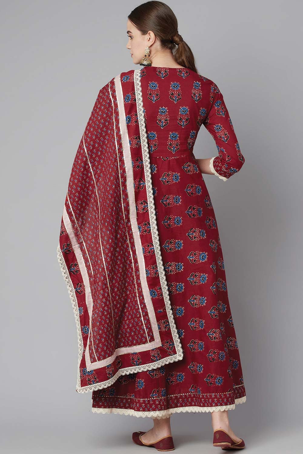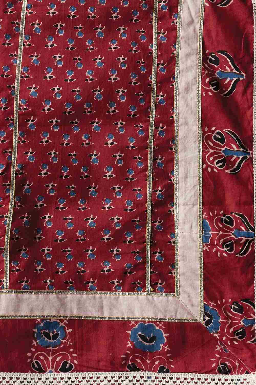 Red Floral Anarkali Cotton Kurti Pant Set With Dupatta