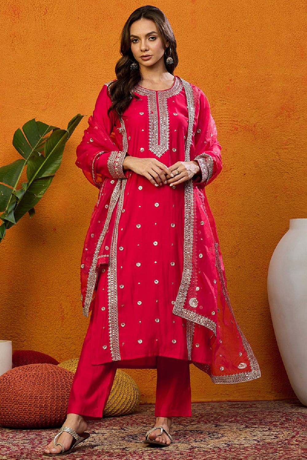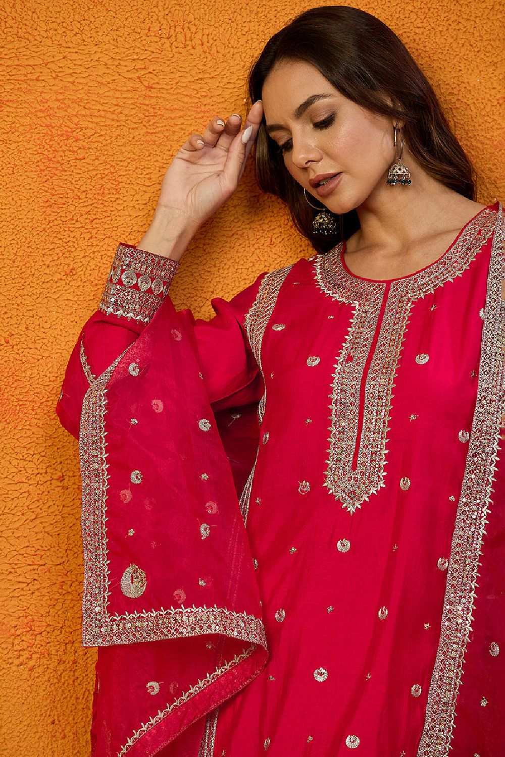 Red Silk Blend Solid Embroidered Straight Cut Suit Set