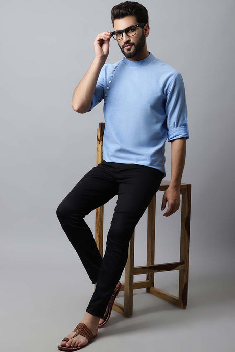 Men's Light Blue Solid Full Sleeve Short Kurta Top