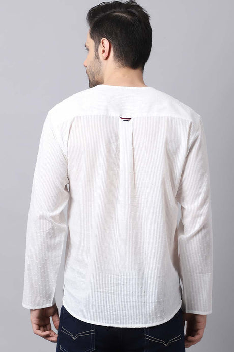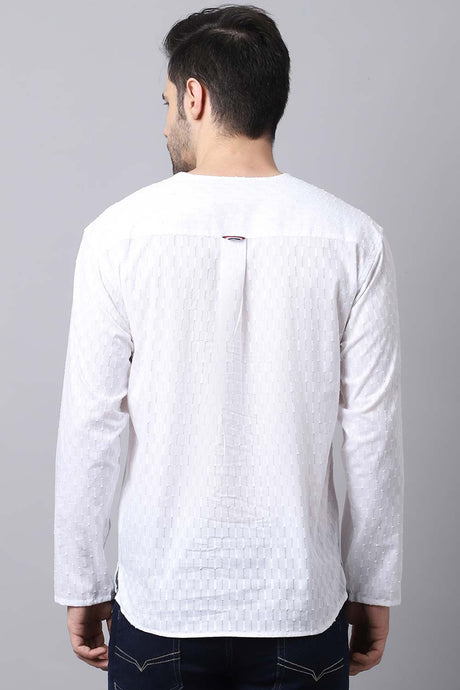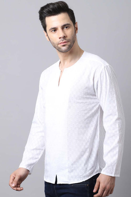 Men's Light White Self-Design Full Sleeve Short Kurta Top