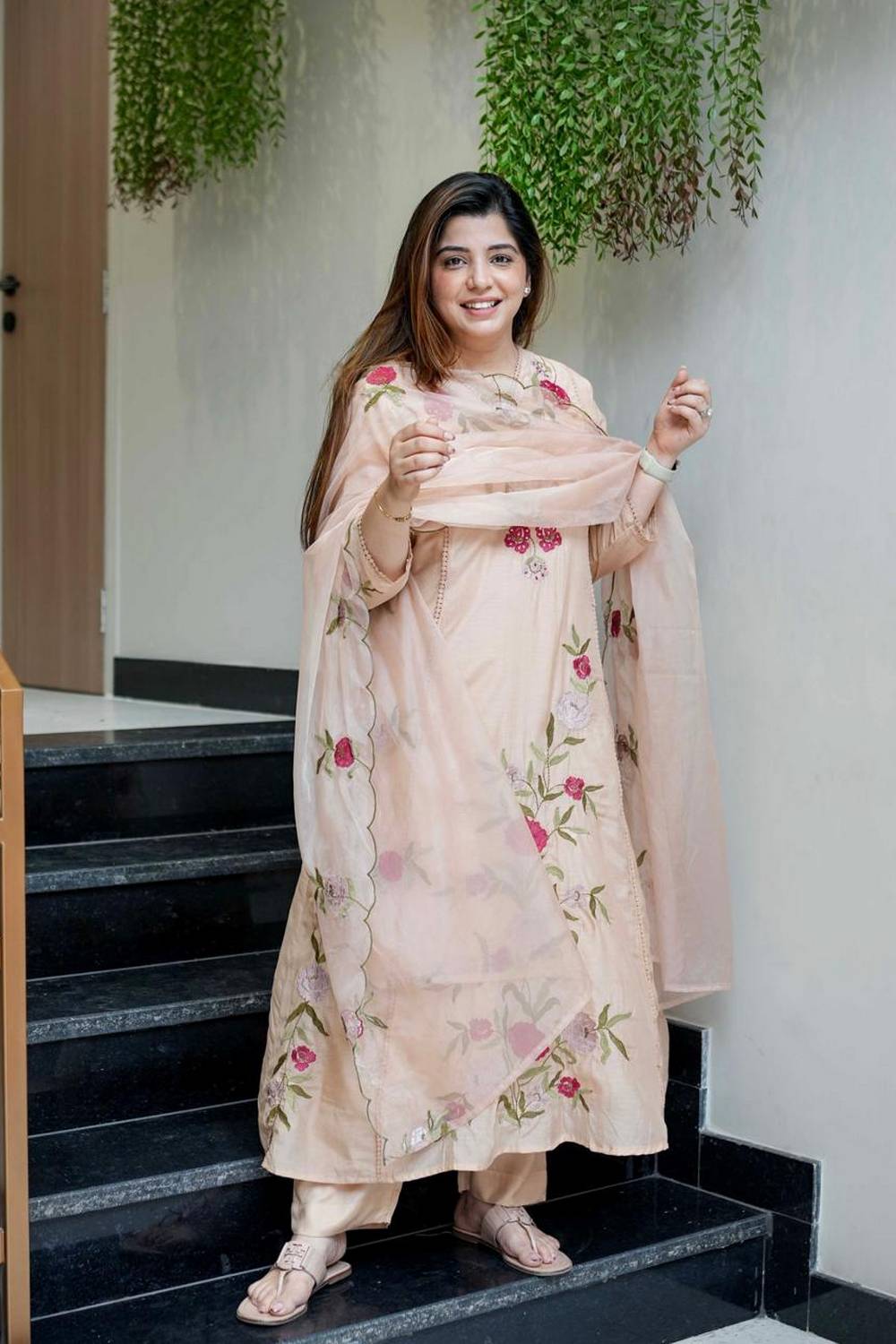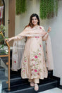 Beige Floral Embroidered Silk Anarkali Suit Set
