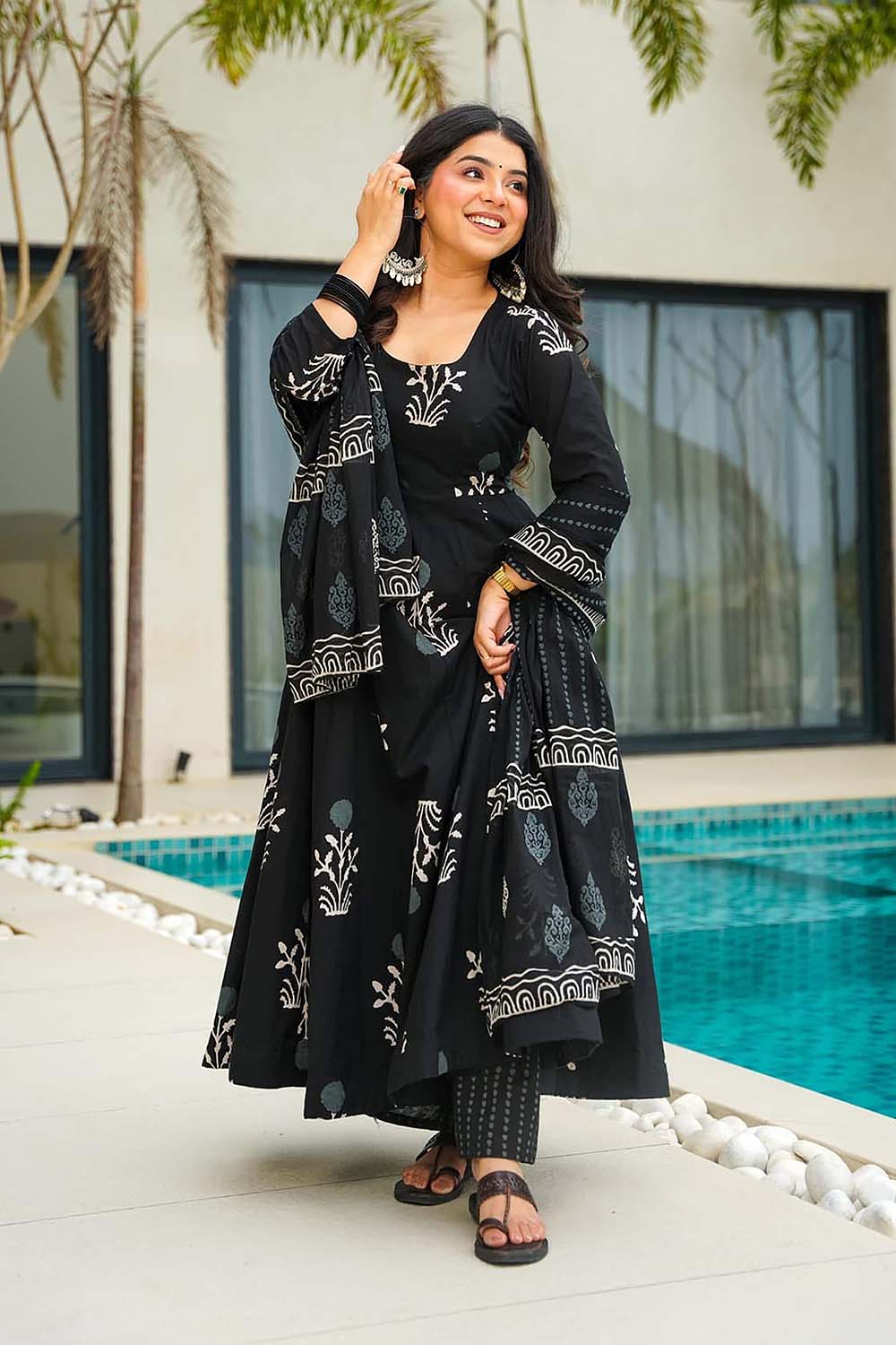 Black Floral Printed Cotton Anarkali Suit Set