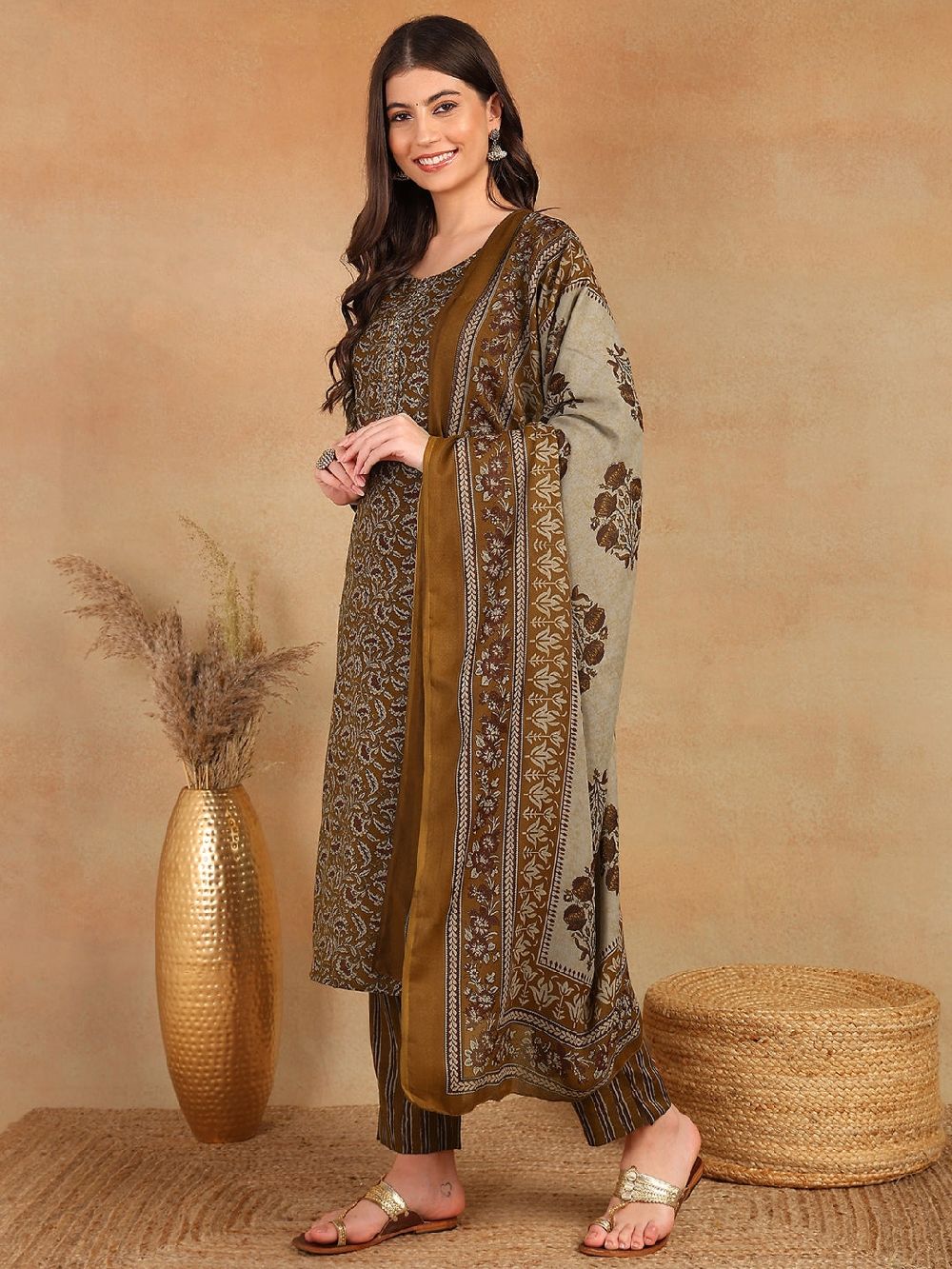 Brown Cotton Blend Ethnic Motifs Printed Straight Kurti Pant With Dupatta