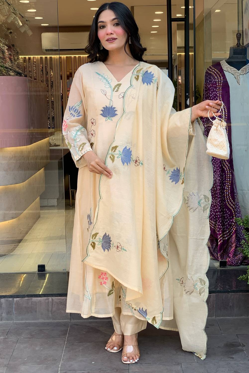Cream Floral Embroidered Chanderi Anarkali Suit Set