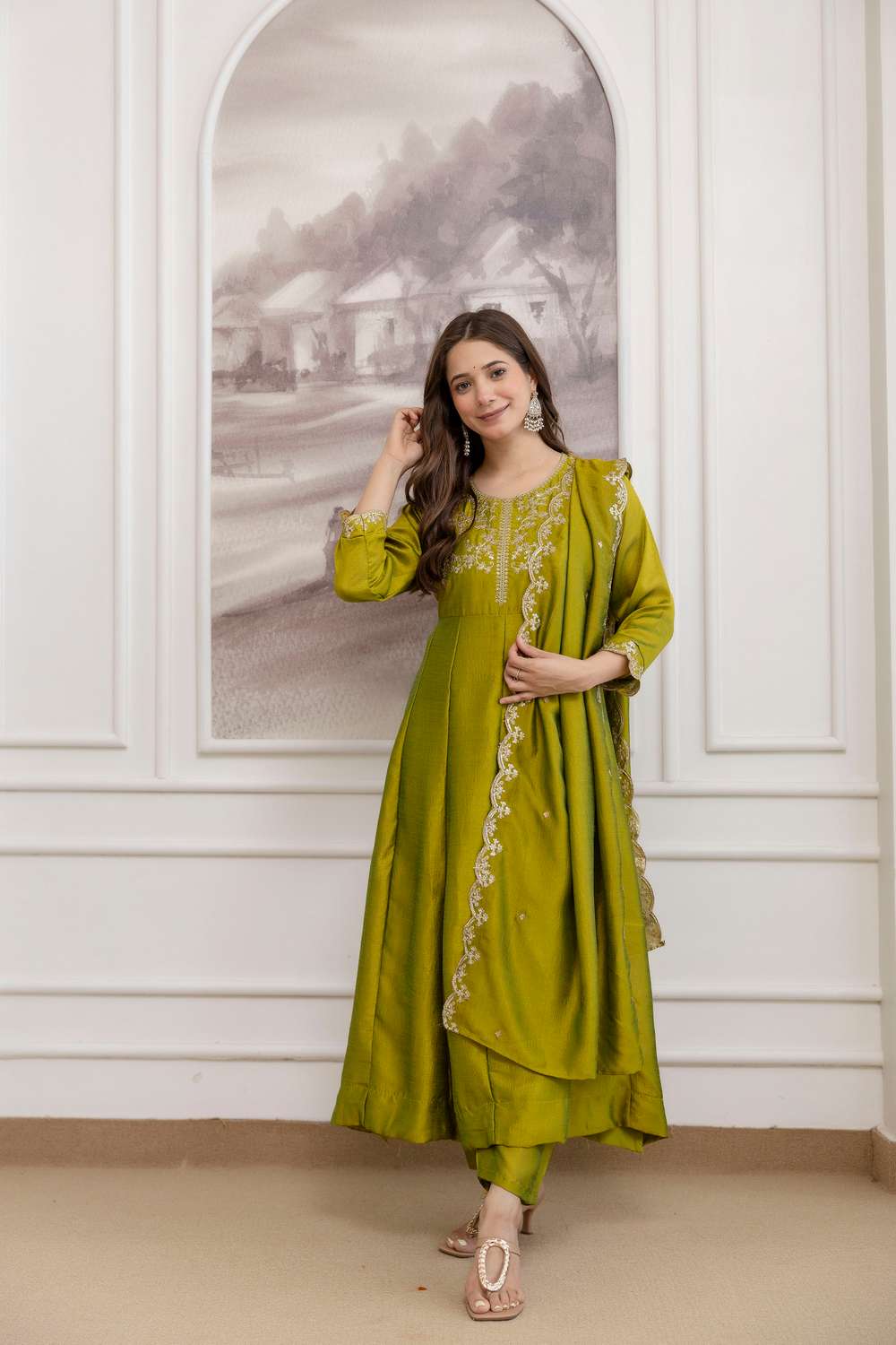 Dark Green Silk Sequin with Embroidered Anarkali Suit Set