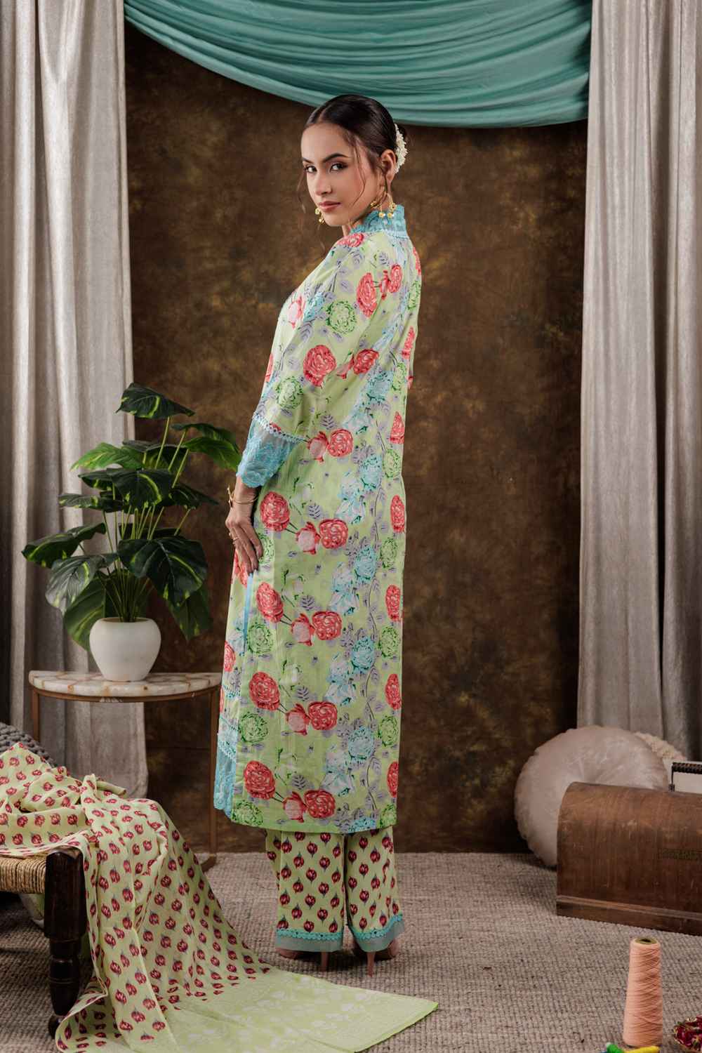 Green Floral Print Beads and Stones Embossed Pure Cotton Kurti Pant Set
