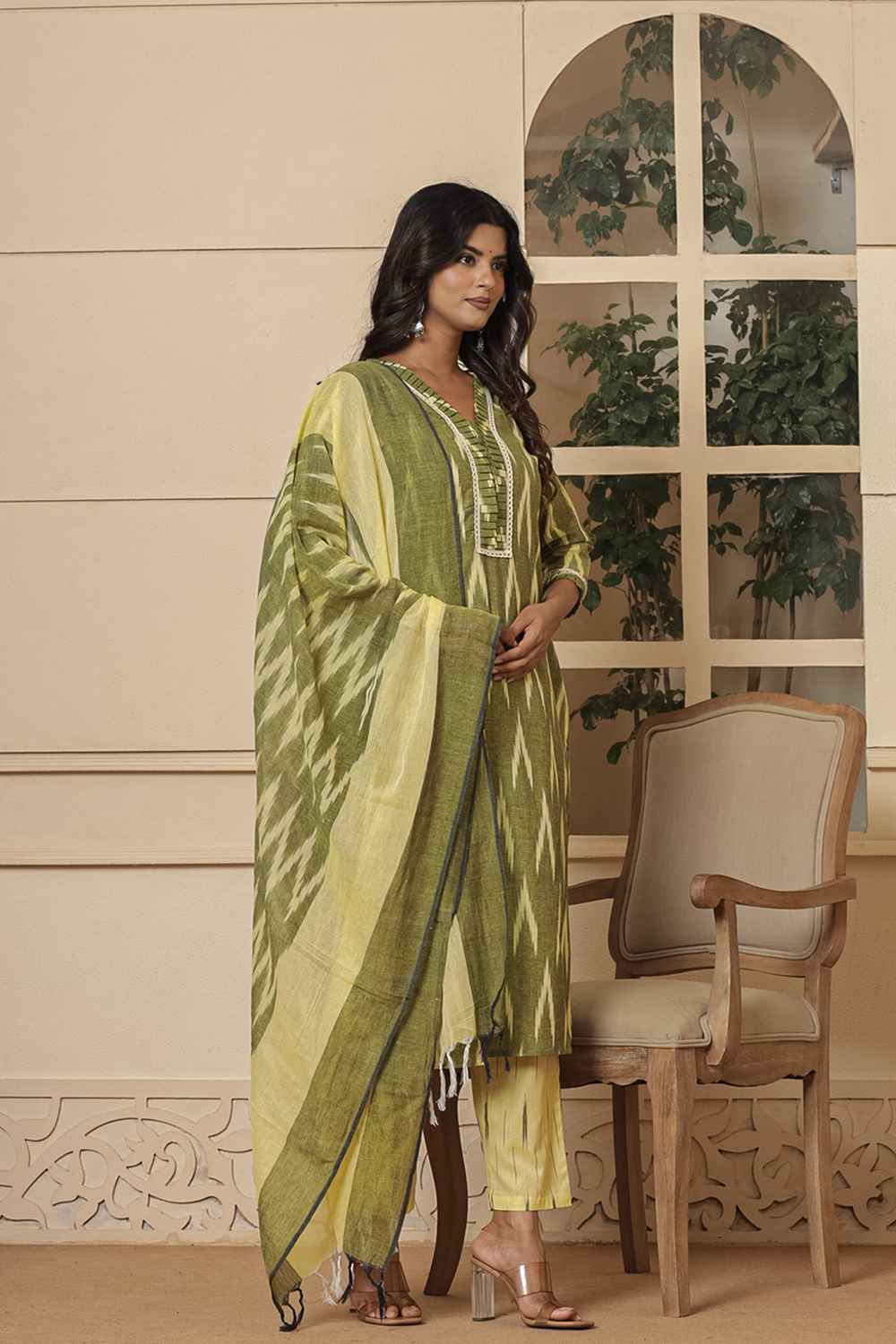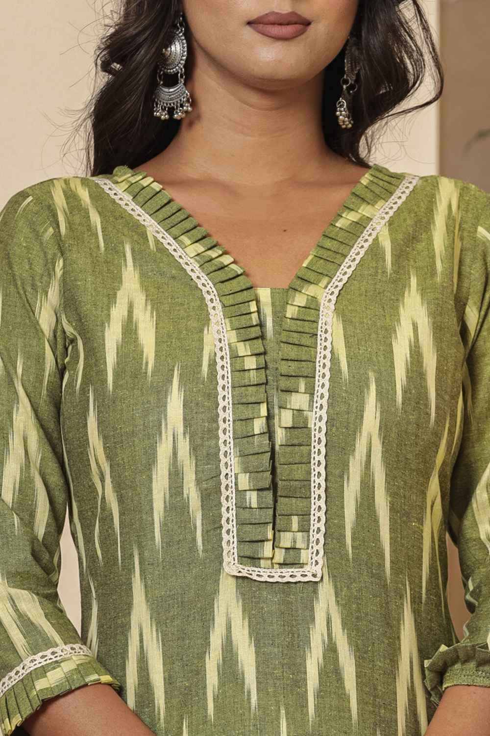 Stay stylish and comfortable with our Kurti Pant Sets designed for all-day elegance. Made with Pure Cotton this set is perfect for easy movement and timeless appeal. The beautiful Ikat Print and intricate elevate its design for casual or daily wear, this Kurti Pant Set is your go-to outfit. Pair it with elegant earrings and kolhapuri sandals or a heels for a traditional look or wedges for a modern edge.