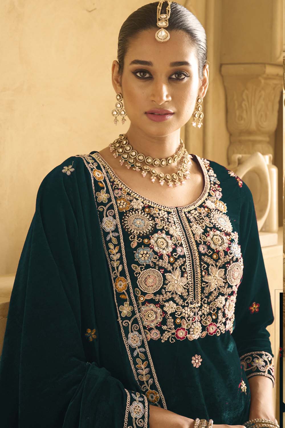 Step into effortless style with our Palazzo Suit Set crafted for the modern woman who cherishes tradition. Made from soft Velvet it keeps you comfortable all day long. The Sequin with Embroidered design lends a touch of sophistication to your outfit. Perfect for Festivewear,Weddingwear,Sangeet,Mehendi this salwar suit is a must-have for versatile styling options. Style it with minimalistic accessories and flats for a casual look or jewelry and heels for special events