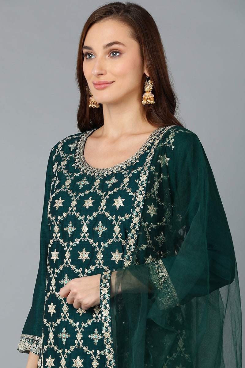 Green Silk Blend Embroidered Kurta Sharara With Dupatta