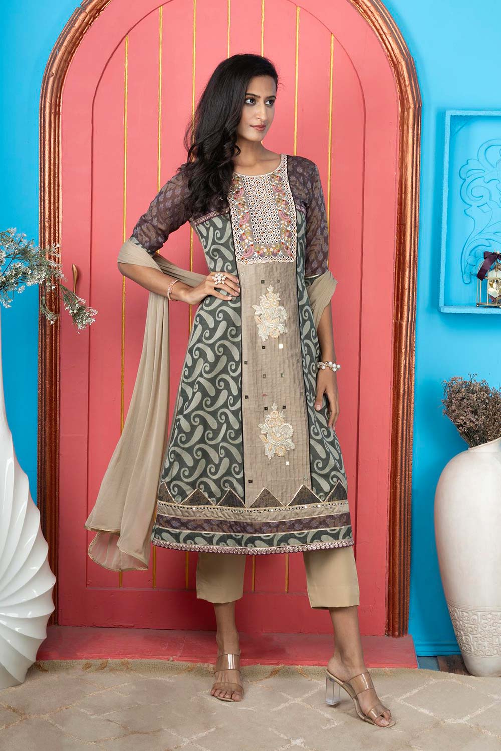 Green Silk Stitched Anarkali Trouser Kurti Dupatta Readymade Suits