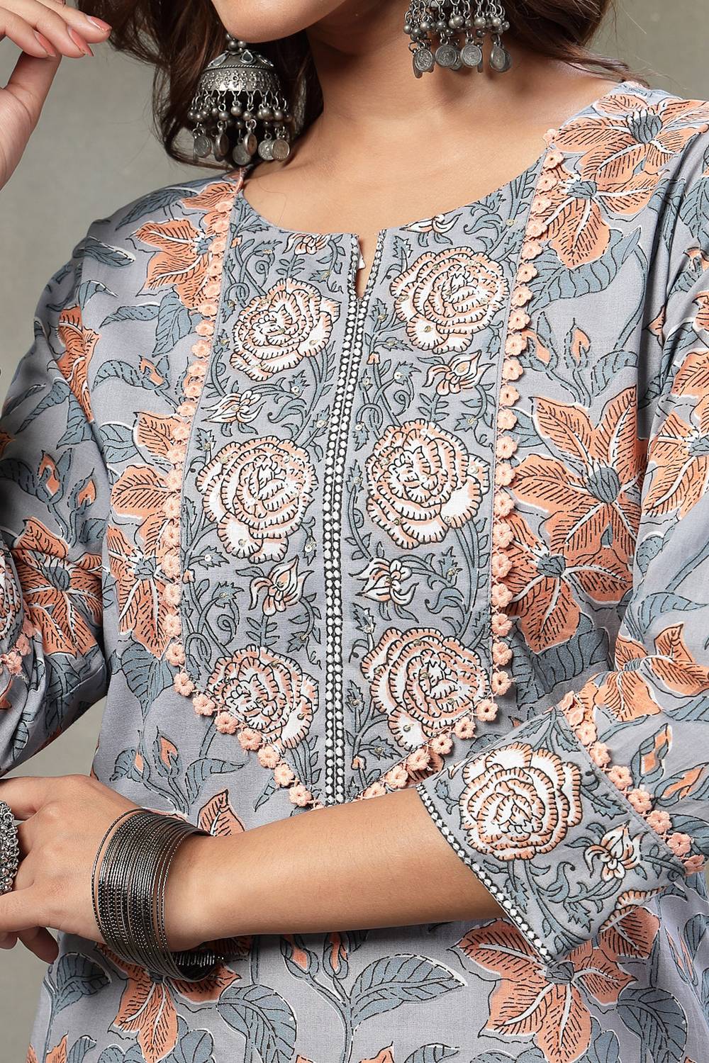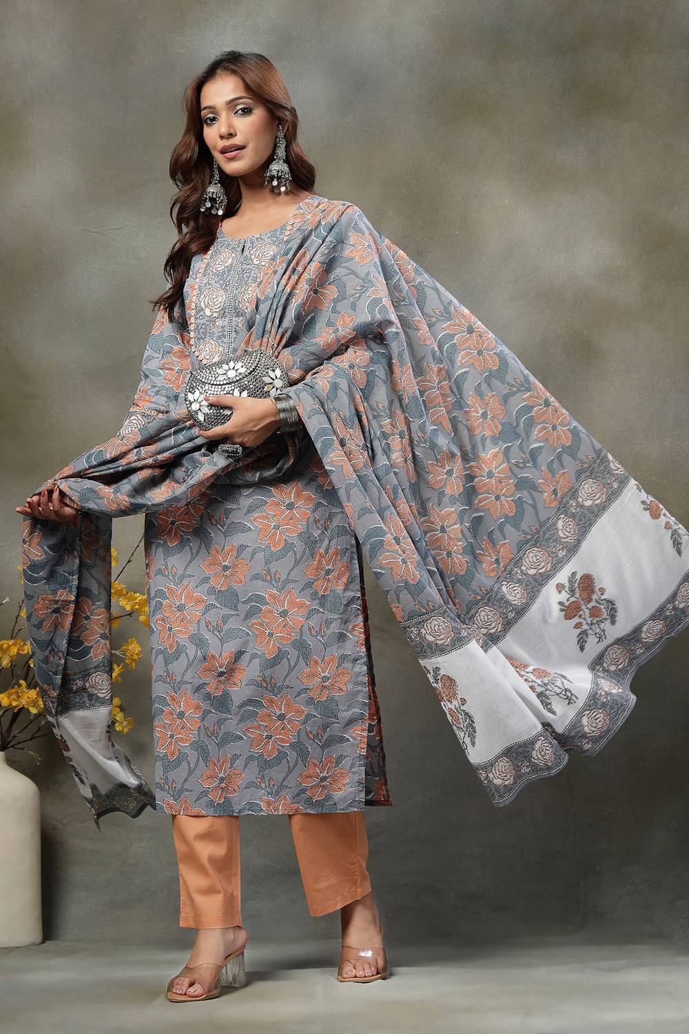 Grey Floral Printed Cotton Straight Cut Suit Set