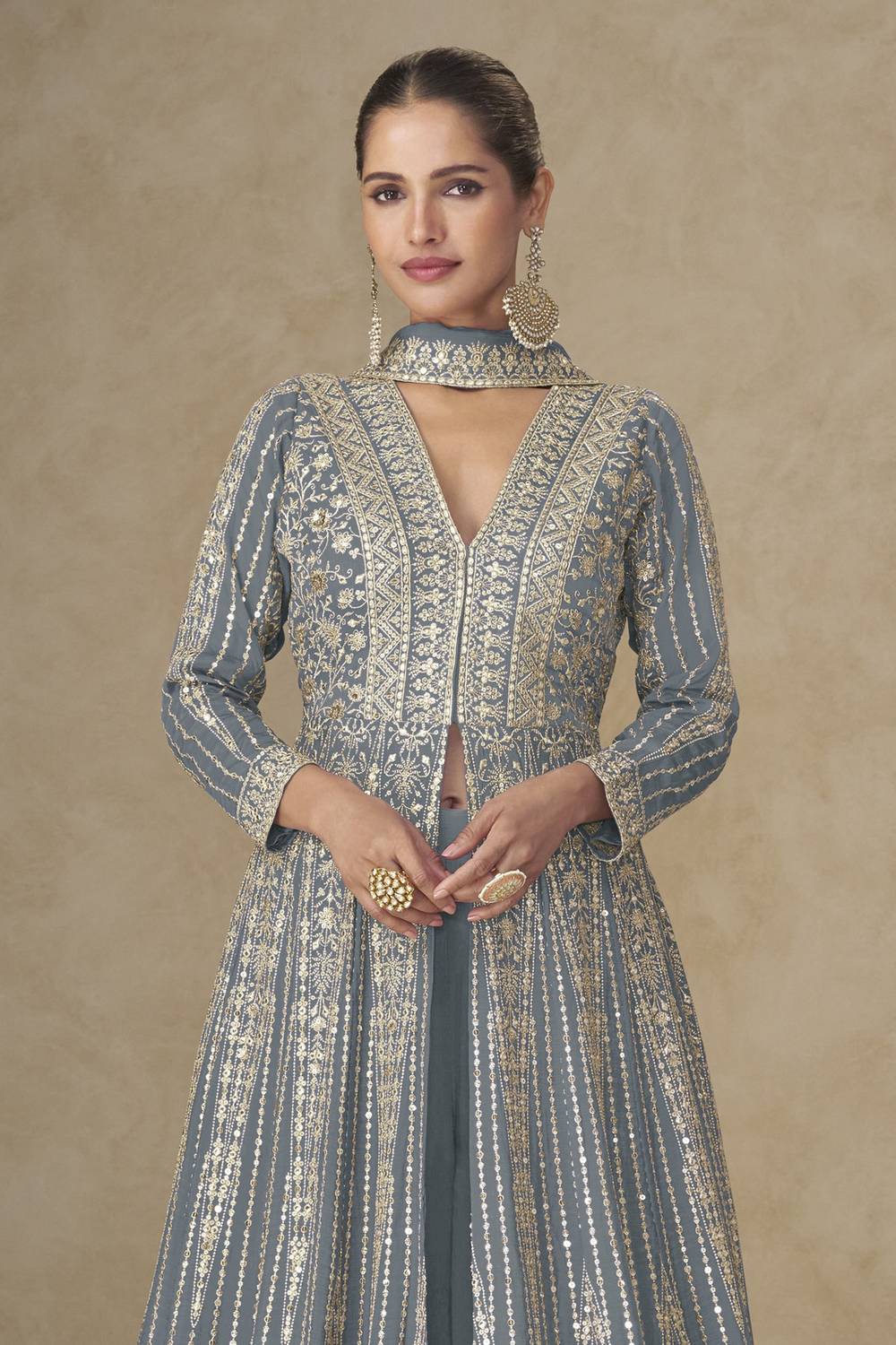 Grey Sequin with Embroidered Chinon Palazzo Suits