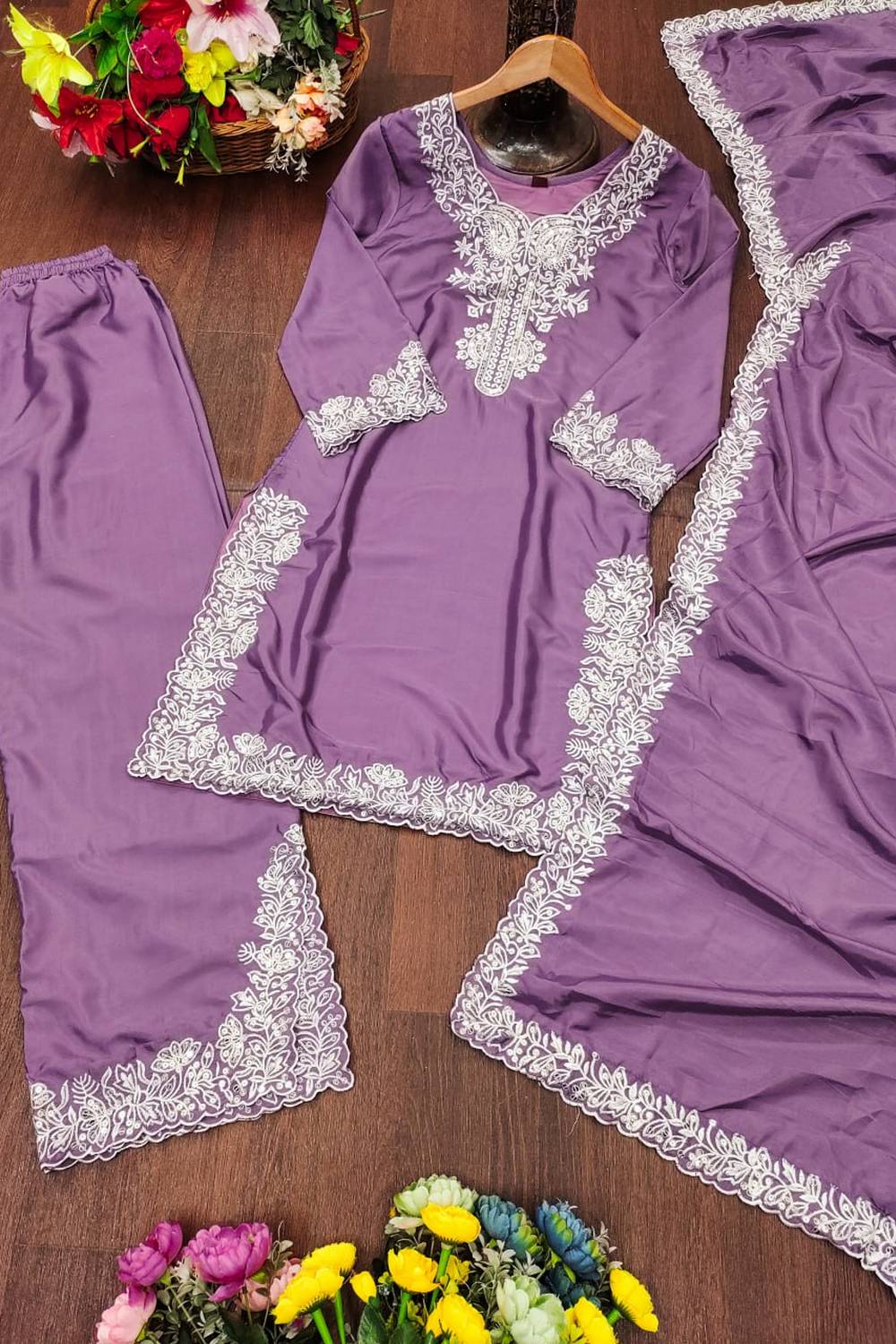 Lavender Embroidered Silk Palazzo Suits