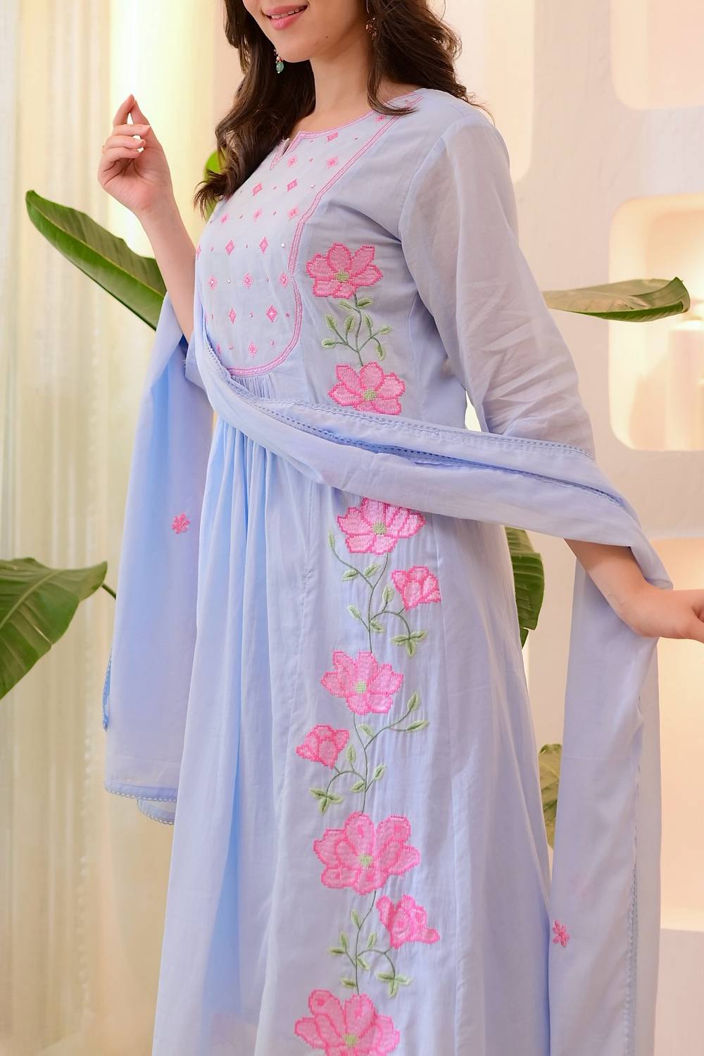 Step into effortless style with our Anarkali Suit Set crafted for the modern woman who cherishes tradition. Made from soft Silk it keeps you comfortable all day long. The Floral Embroidered design lends a touch of sophistication to your outfit. Perfect for Casual this Anarkali Suit Set is a must-have for versatile styling options