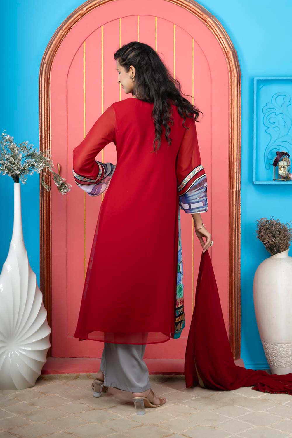 The Maroon Georgette Stitched Anarkali Palazzo Kurti Dupatta Readymade Suit is a stunning ensemble that beautifully combines traditional elegance with modern flair. Crafted from lightweight georgette, the Anarkali Kurti features a flowing silhouette that flatters the figure, perfect for festive occasions or special events.