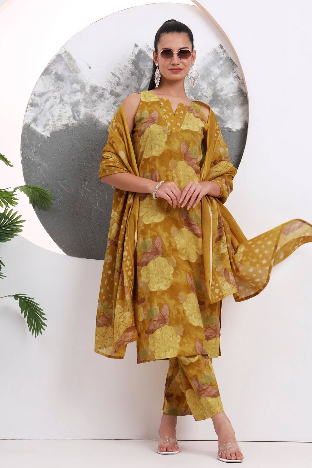 Mustard Floral Printed Cotton Straight Cut Suit Set